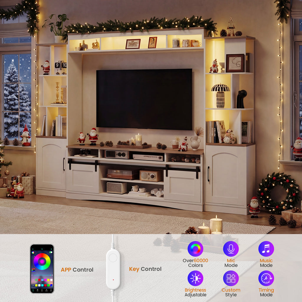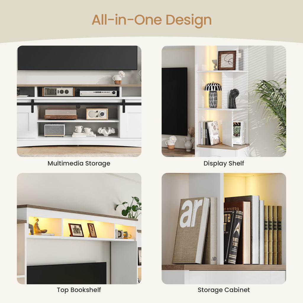 A modern all-in-one wall unit TV stand designed for 50"–75" TVs, combining a bookshelf, display shelves, and storage cabinets in one sleek white design. Featuring multi-color LED lighting controlled by app or remote and adjustable side shelves for a customizable layout, it enhances both functionality and ambiance. Spacious, stylish, and easy to assemble, it’s a perfect centerpiece for contemporary living spaces.