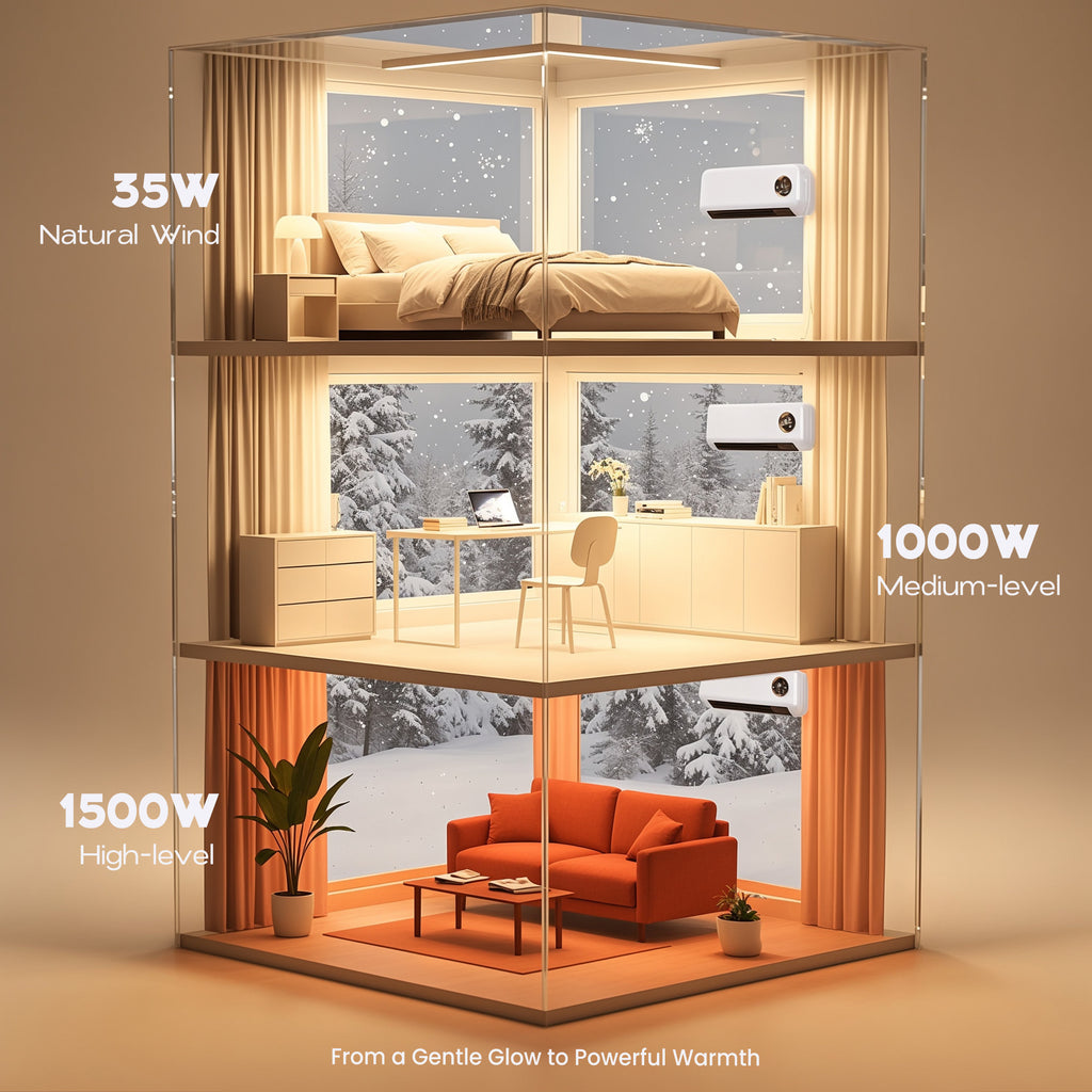 Three Smart Temperature Settings: Your Comfort, Your Control - Choose your perfect atmosphere: the gentle breeze of 'Natural Wind'(5W) for fresh air circulation, the comforting 'Warm Wind'(1000W) to take the edge off a cool evening, or the powerful 'High Heat' (1500W)to quickly melt away the deepest chill. Choose different gears according to the appropriate environment to avoid wasting resources and saving your electricity bills.