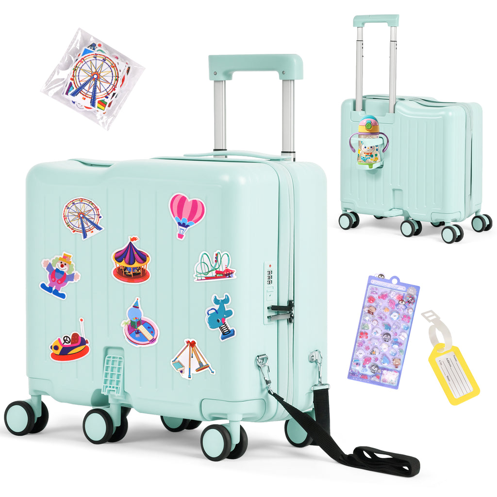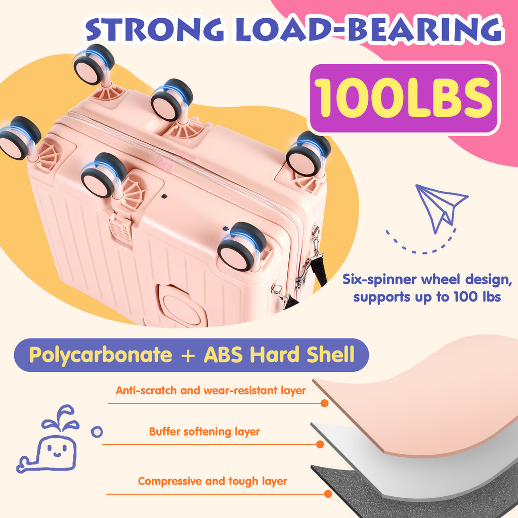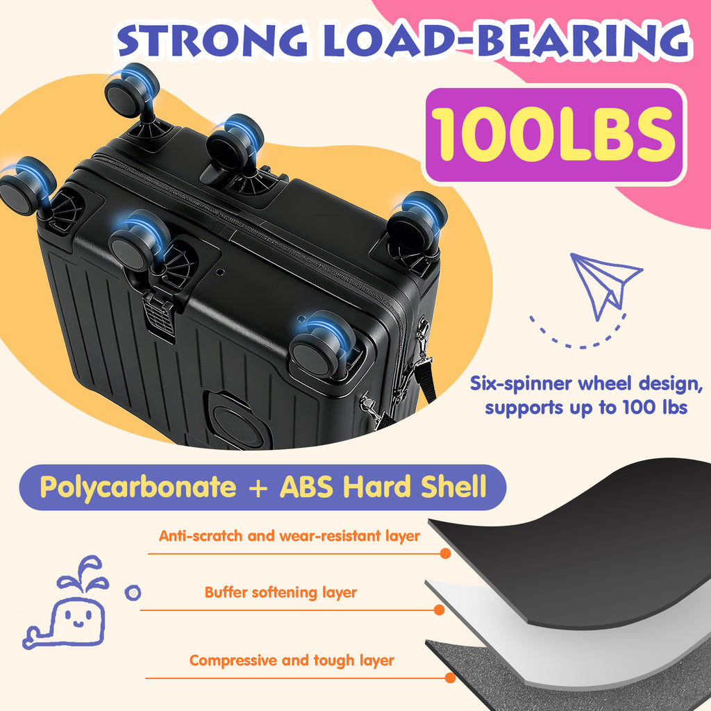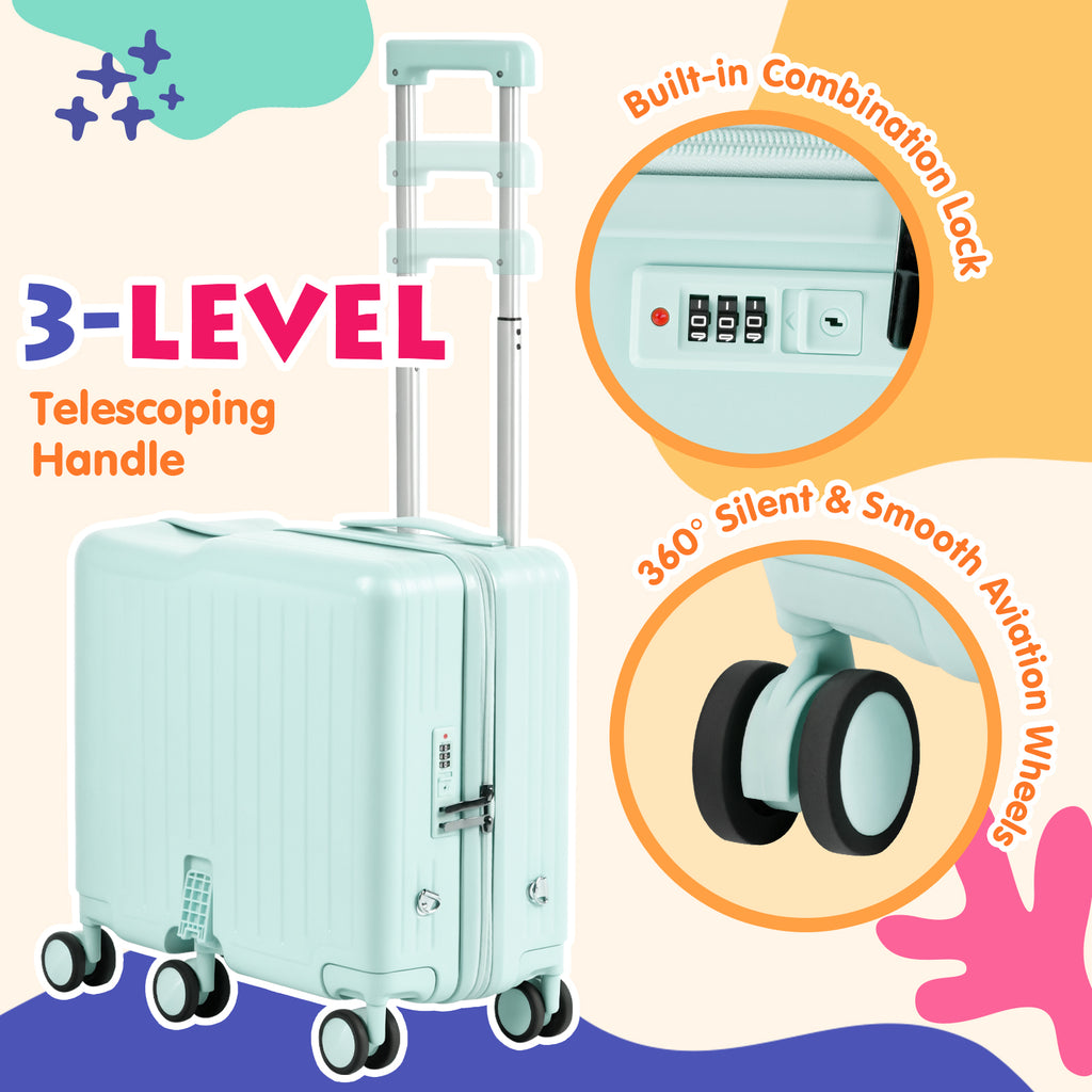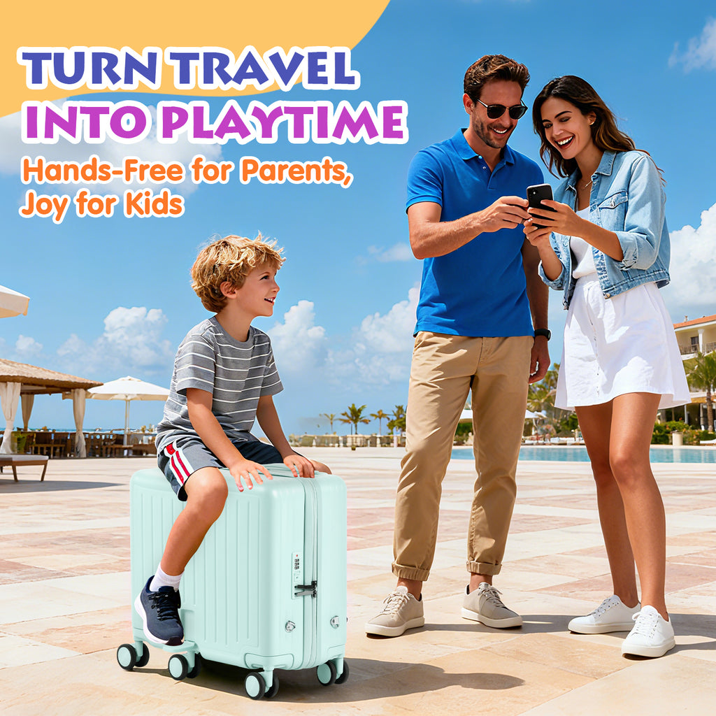 This 20-inch kids’ ride-on luggage combines fun and function with 6 spinner wheels, foldable pedals, and a pull rope for safe, stable riding. Lightweight yet durable, it features a spacious interior, mesh pockets, a telescopic handle, and a secure combination lock—making it the perfect carry-on companion for young travelers.