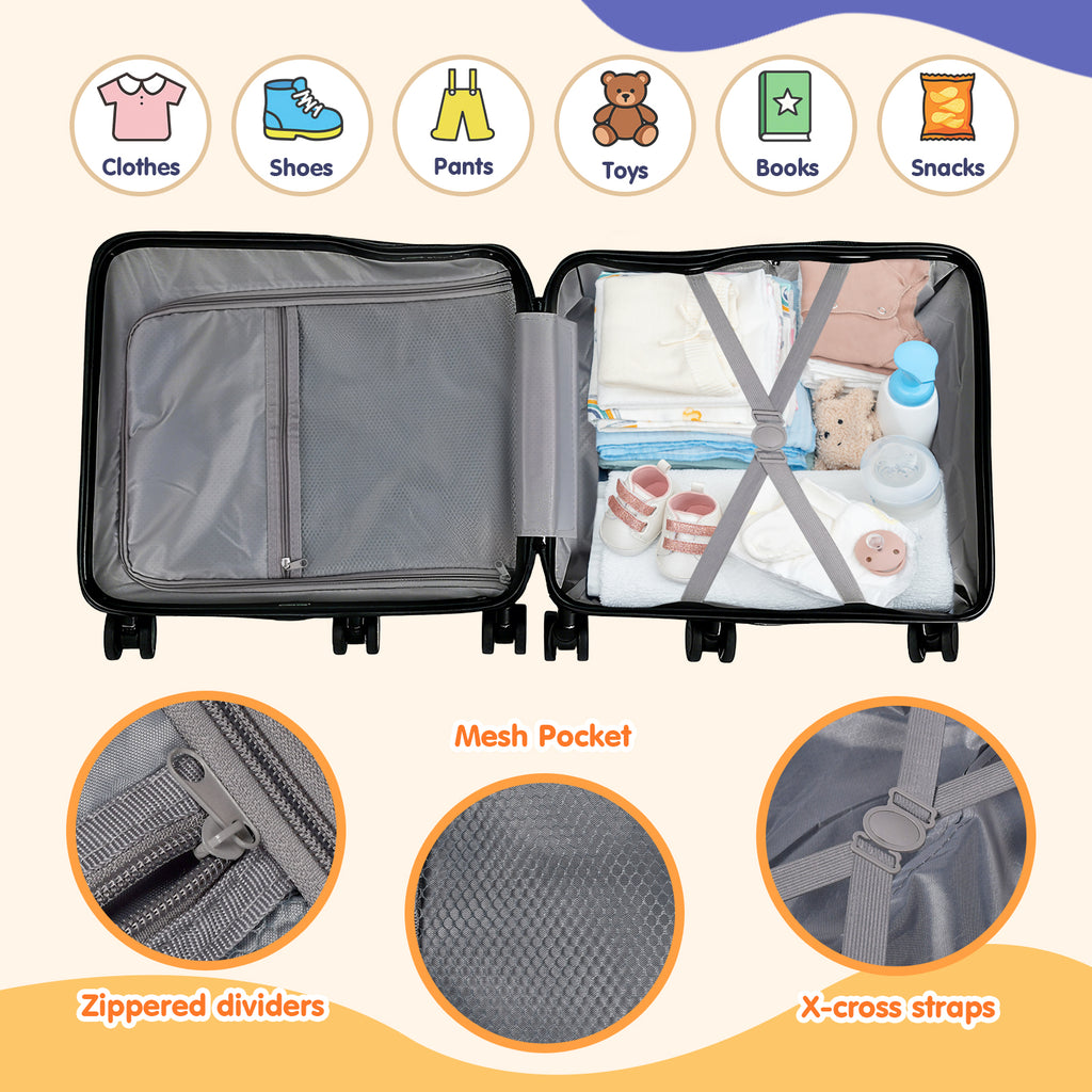 - Large Storage Space: This toddler ride-on carry-on suitcase features a spacious zippered compartment to organize and separate essentials, making packing easy. Mesh pockets provide extra space for smaller items, keeping everything tidy and accessible during travel.