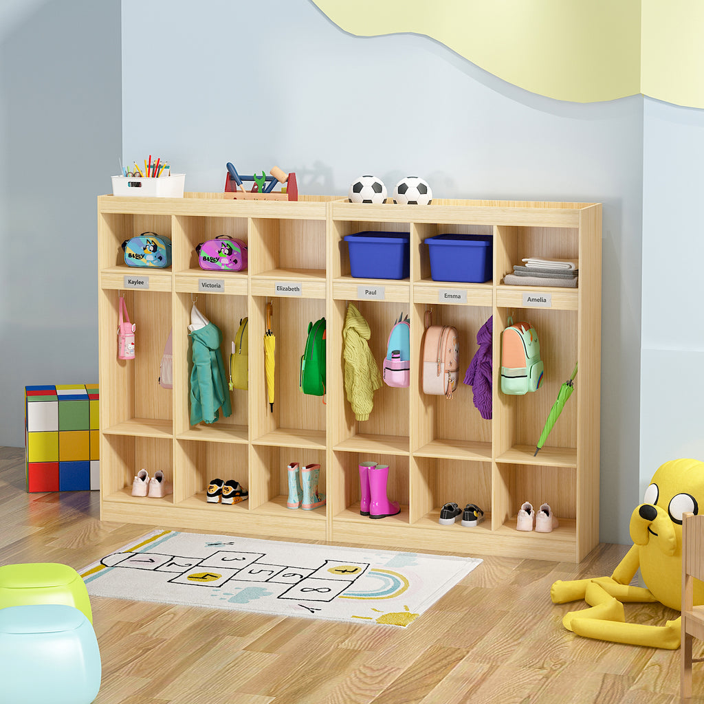 Keep kids organized with this durable wooden coat locker, featuring 3 coat areas, 6 hooks, and 6 cubbies for bags, shoes, and clothes. Includes a safe acrylic mirror and name tag slots for personalization. Perfect for schools, daycare centers, or home entryways, it’s sturdy, easy to clean, and simple to assemble.