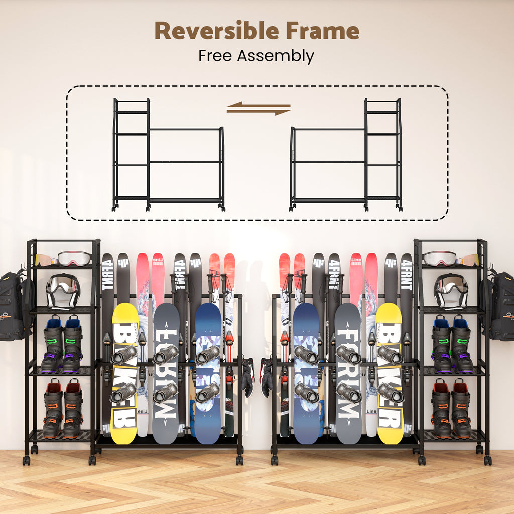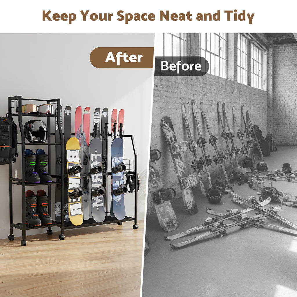 Keep all your winter gear organized with this all-in-one ski storage rack, designed to hold skis, snowboards, helmets, boots, goggles, and more in one compact space. Featuring adjustable shelves and a customizable snowboard section, it easily accommodates taller items while anti-slip pads ensure stability. The heavy-duty perforated steel shelves support up to 4 pairs of skis and 3 snowboards, while 4 included S-hooks keep accessories within reach. With 6 smooth-rolling wheels (3 lockable) and interchangeable base feet, this freestanding rack offers effortless mobility and space-saving convenience. Simple instructions and included tools make assembly quick and stress-free.