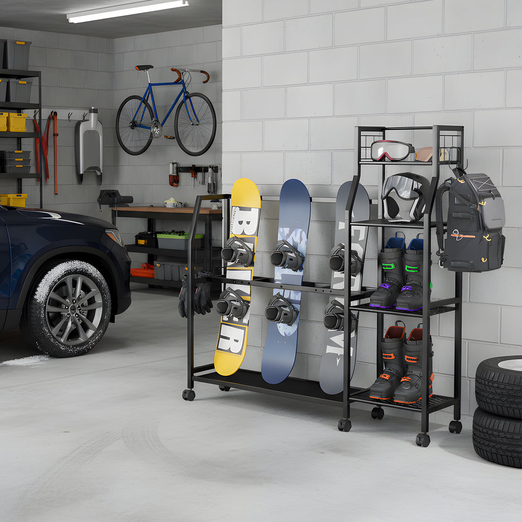 All-in-One Ski Rack: Stores skis, snowboards, helmets, boots, gloves, goggles, and more in one convenient rack