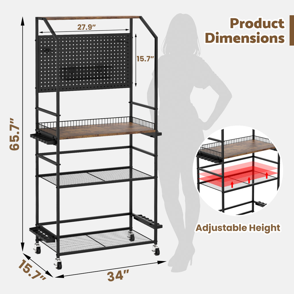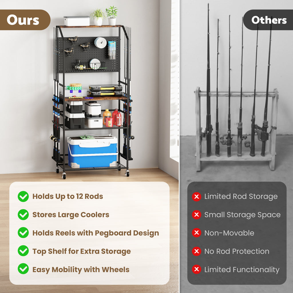 A space-saving fishing rod storage rack designed to organize up to 12 fishing rods, reels, tackle boxes, and accessories in one sturdy unit. Featuring adjustable shelves, a pegboard organizer, and lockable wheels for easy mobility, it keeps all your fishing gear neatly stored and ready to go—perfect for garages, sheds, or indoor use.