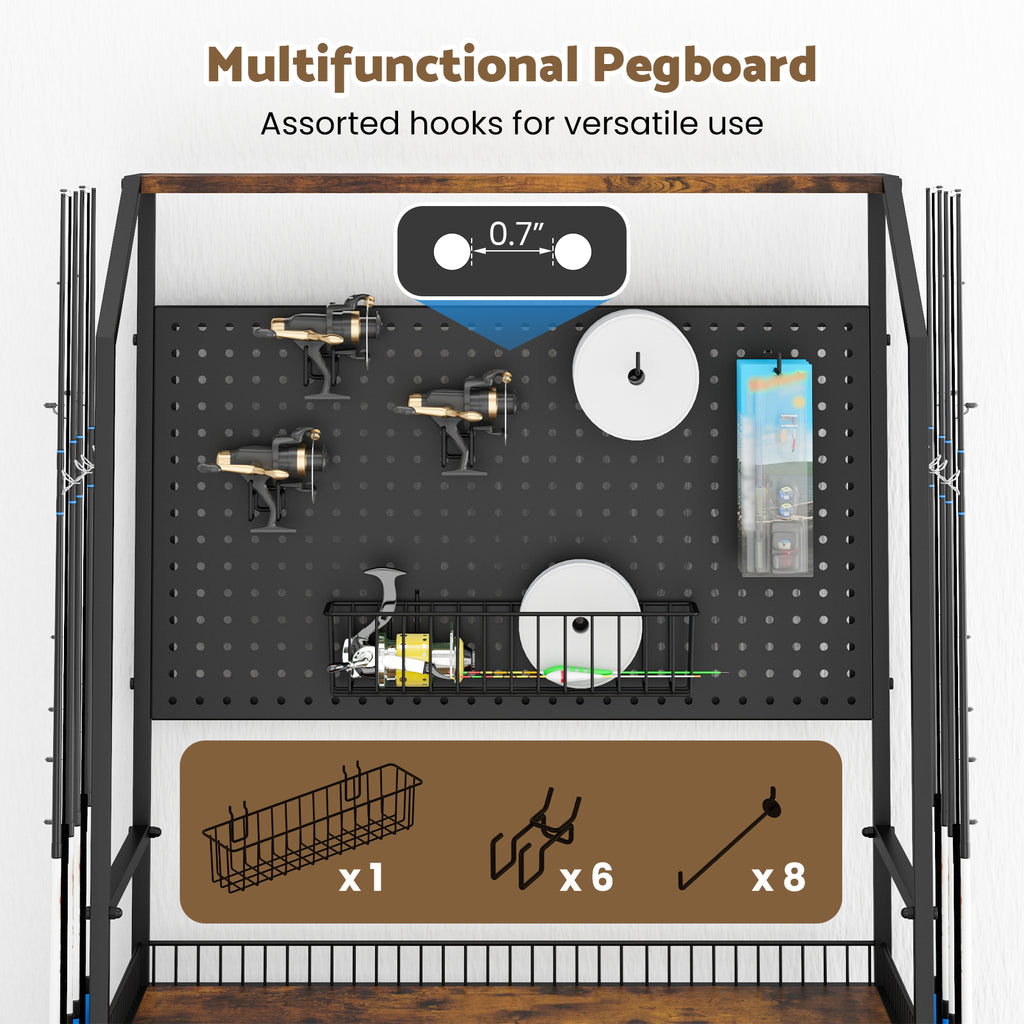 - Pegboard Organizer: Includes 6 reel hooks, 8 straight hooks, and a storage basket for tools and accessories