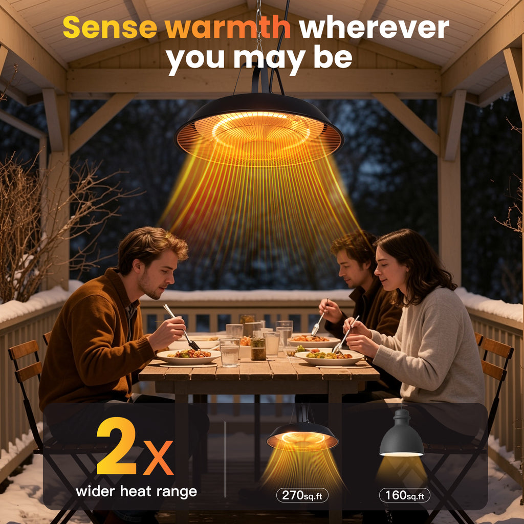 Enhanced Safety Features: Stay safe with tip-over and overheat protection in this outdoor hanging heater. Whether you mount it in a garage, hang it under a gazebo, or use it as a tent heater for camping, this electric patio heater outdoor shuts off automatically when safety thresholds are met—ideal for families and pets.