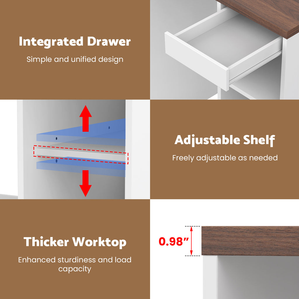 Optimize your space with this all-in-one mini fridge stand, perfectly sized for 3.2–4.4 Cu.Ft mini-fridges. Featuring a thickened tabletop, reinforced structure, hidden drawer, and adjustable shelves, it securely holds appliances while keeping your coffee bar, liquor station, or kitchen organized. Easy assembly with included hardware and instructions.