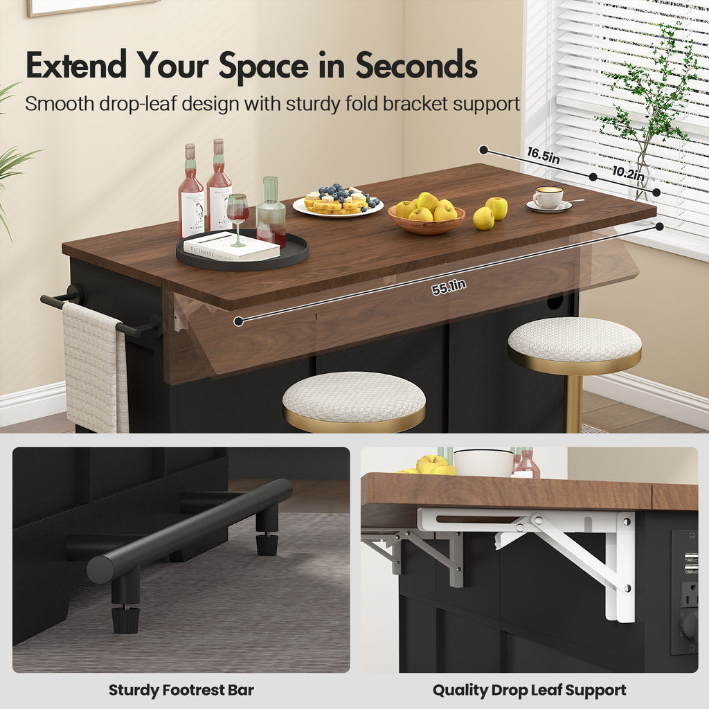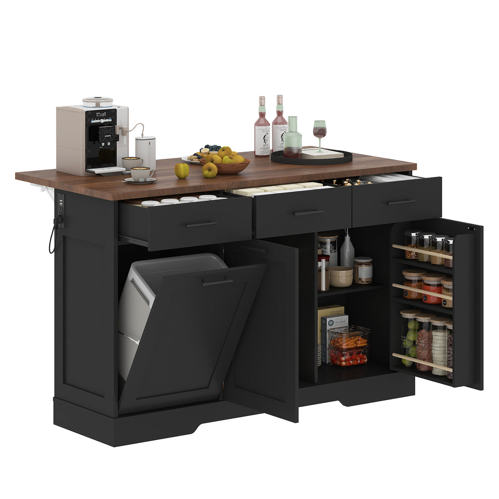 Transform your kitchen with this multifunctional expandable kitchen island. Featuring a drop-leaf tabletop for flexible dining, a built-in power station with USB ports, and ample storage including drawers, adjustable shelves, and a trash cabinet, it keeps everything organized and within reach. The sturdy counter height design doubles as a breakfast bar or coffee station, while the waterproof MDF build and elegant walnut finish bring both durability and modern style to any space.