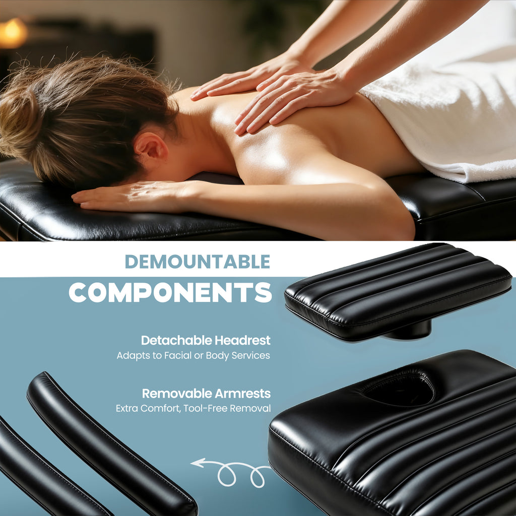 - Comfort-Driven Design: Removable headrest and armrests ensure maximum client comfort and accessibility. The ergonomic design and high-resilience foam ensure a relaxing experience for clients of all body types.