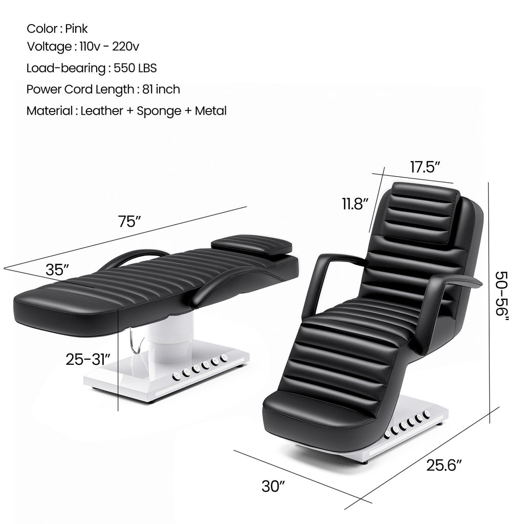 Meet the ultimate all-in-one electric spa bed. Easily adjust height, backrest (90°), and leg rest (90°) via foot control or remote. Features a built-in LED light for perfect visibility and ambiance. Designed for maximum comfort (removable headrest/armrests) and durability (PU leather, 550lb capacity). Ideal for facials, massages, tattoos, waxing & more.