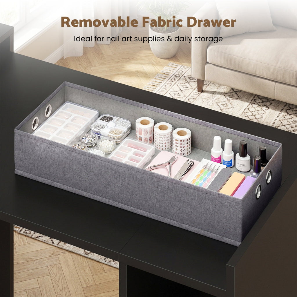 - Ample Storage for Nail Supplies: Spacious tabletop with open compartments and a 3-tier adjustable shelf for organized storage. Includes a removable non-woven drawer for nail polish and tools, plus two foldable adhesive racks for small items.