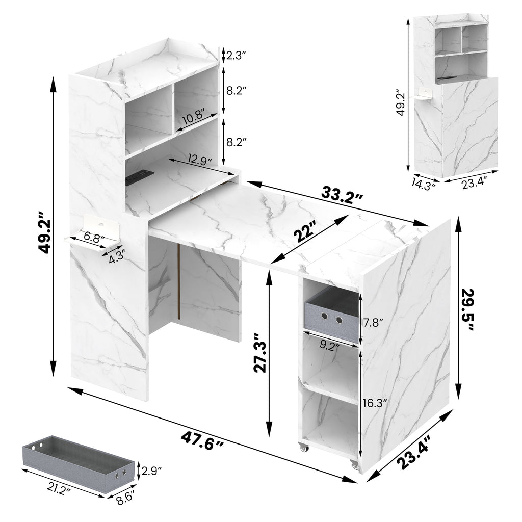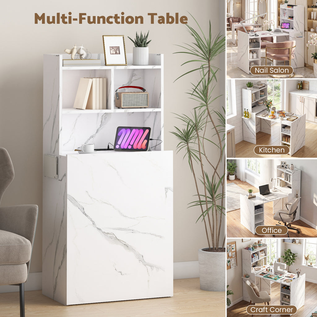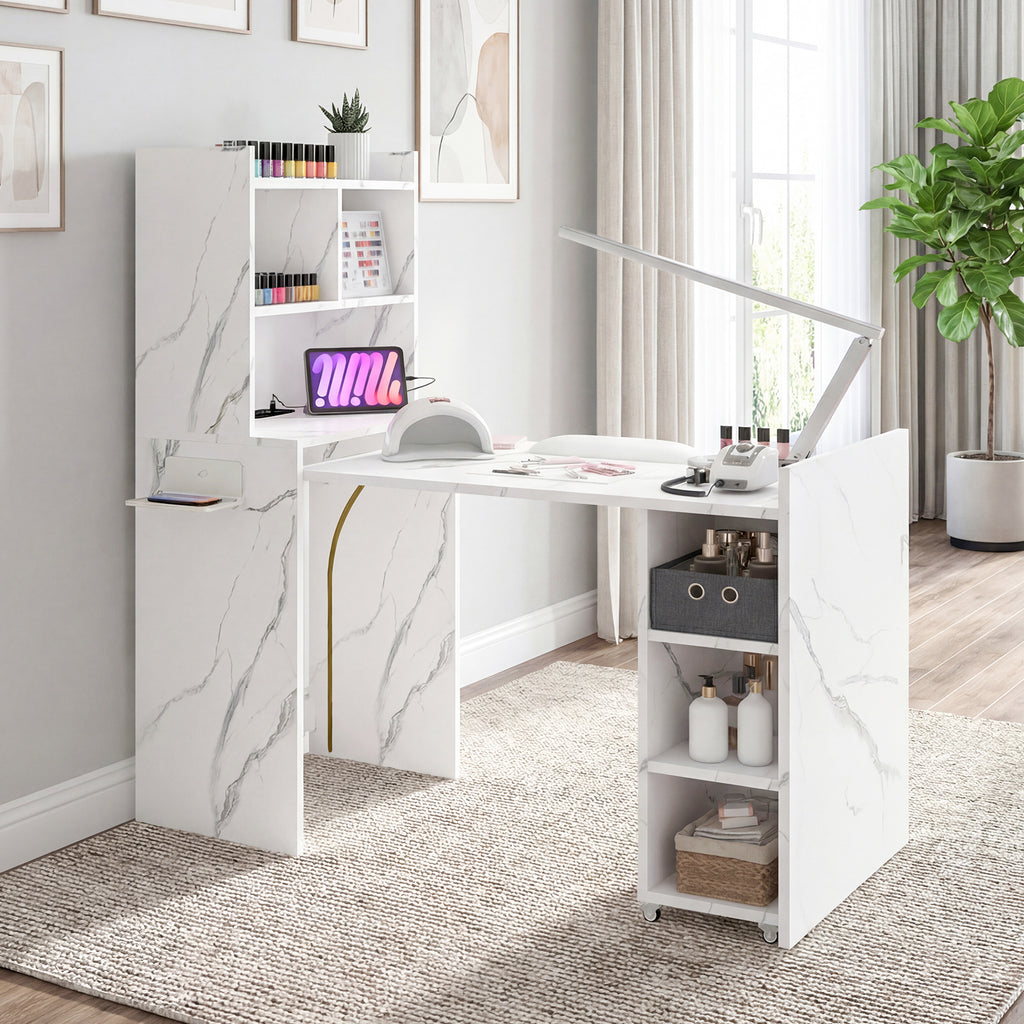 This 2-in-1 folding nail desk easily transforms from a compact cabinet into a full manicure workstation, making it ideal for home salons and small spaces. It features ample storage with shelves, compartments, and foldable racks, plus a built-in charging station with AC outlets, USB, and Type-C ports for powering nail tools. Made from durable engineered wood with an anti-tip design, this versatile table can also be used as a computer desk, craft table, or sewing table.