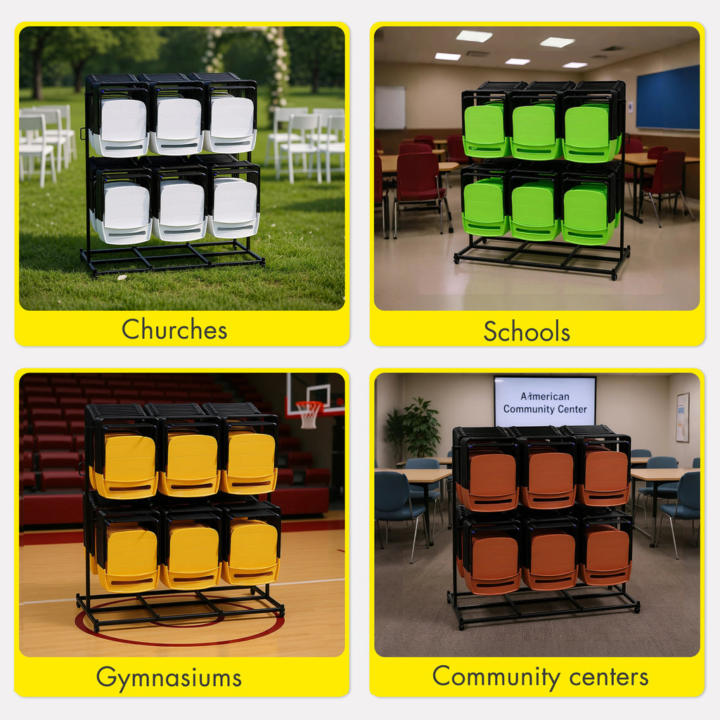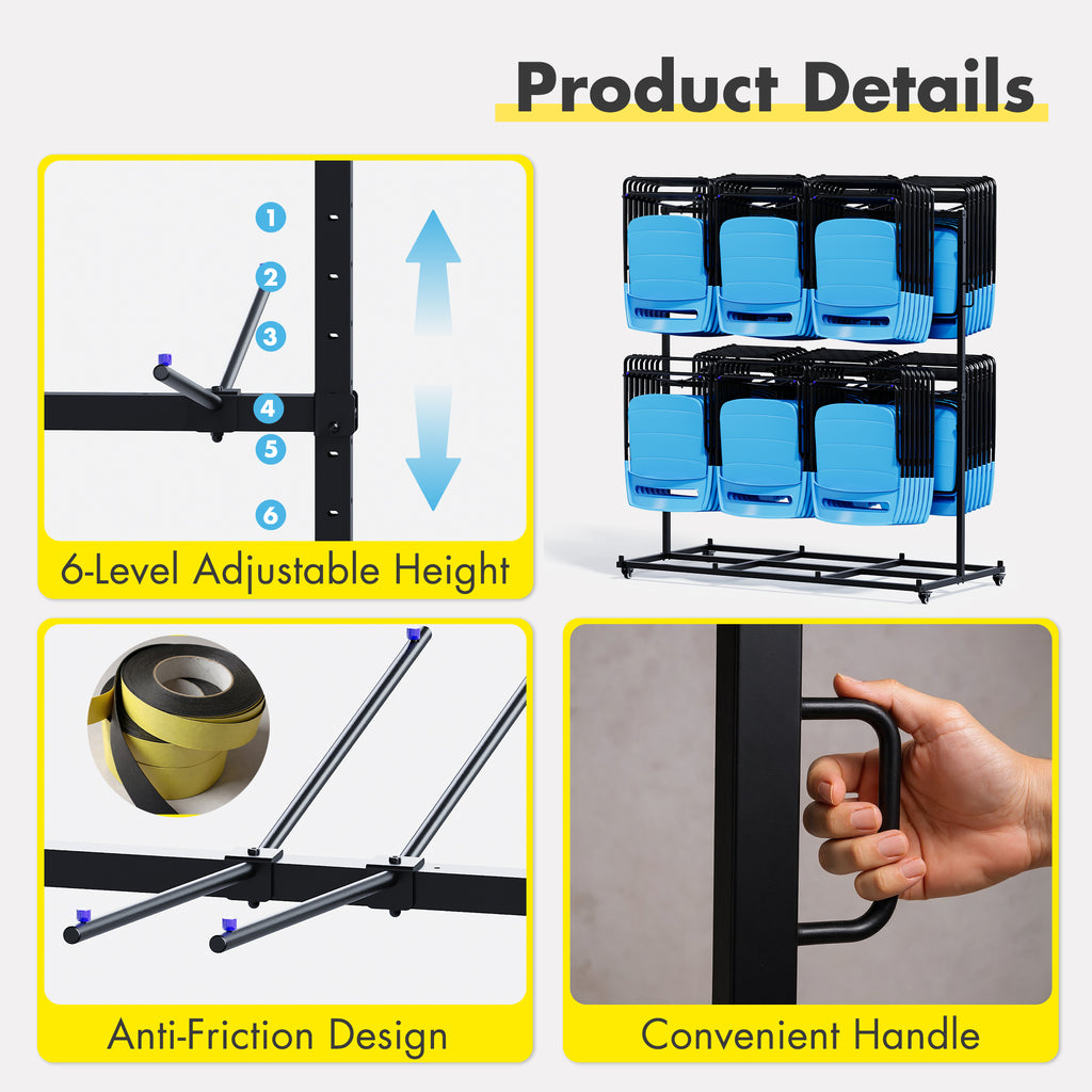 Keep your chairs organized with this heavy-duty folding chair storage rack. It holds up to 84 chairs or 42 chairs and 12 tables (800 lbs), features 360° lockable wheels, side handles, and a weatherproof dust cover for easy, protected storage—perfect for events, churches, or schools.