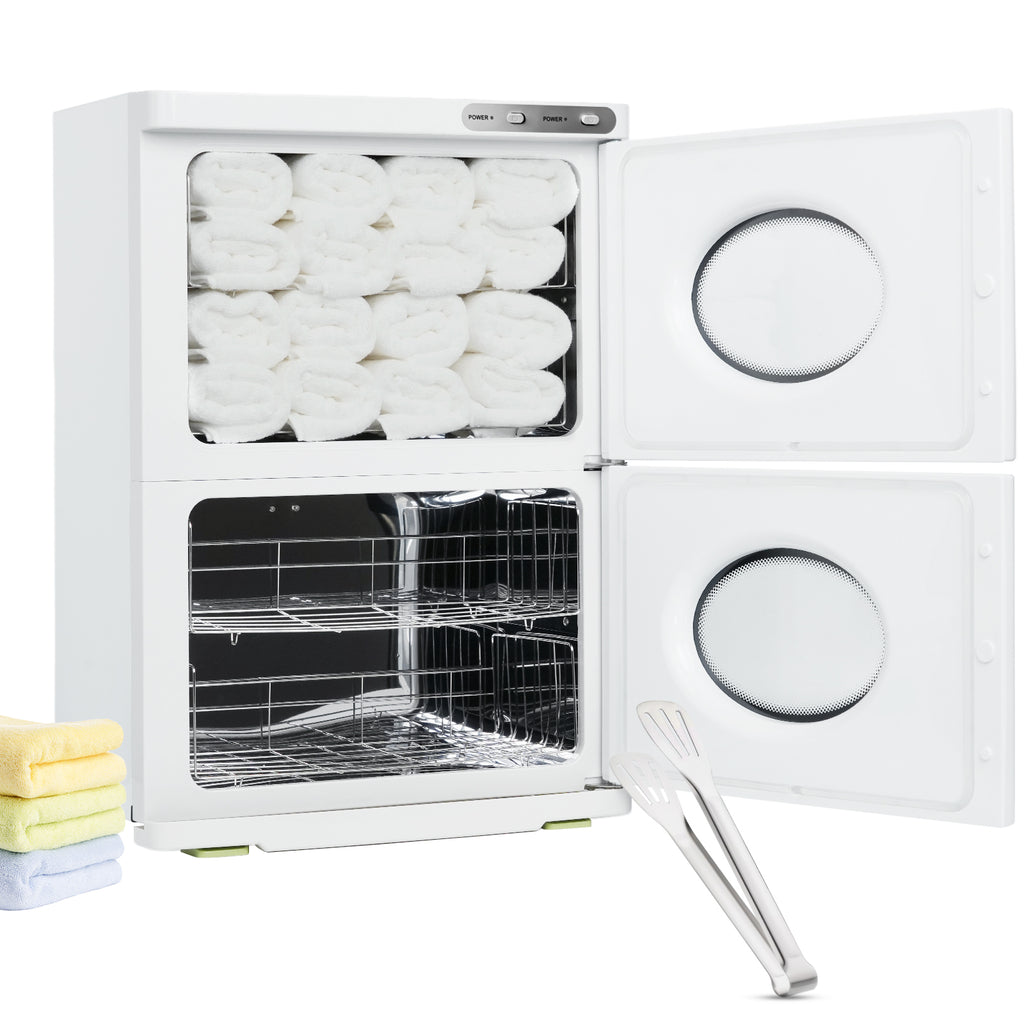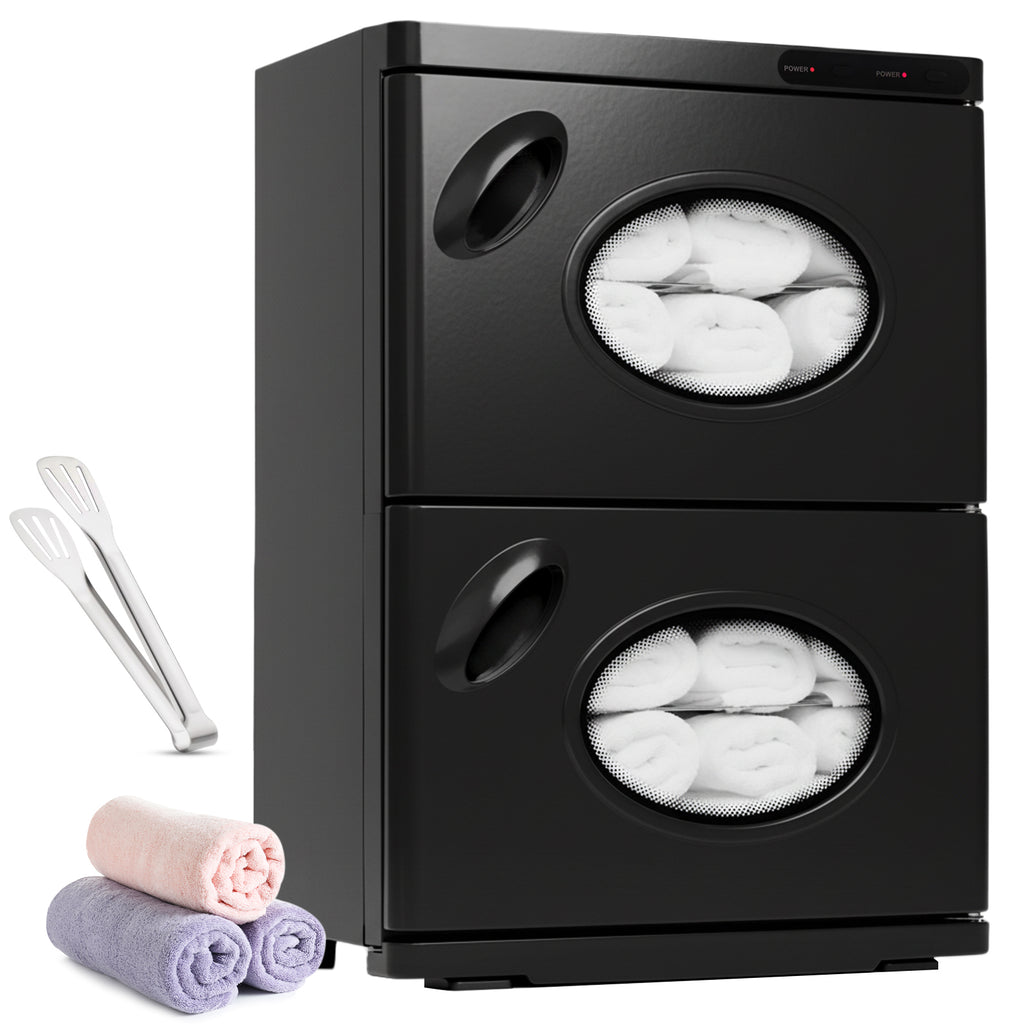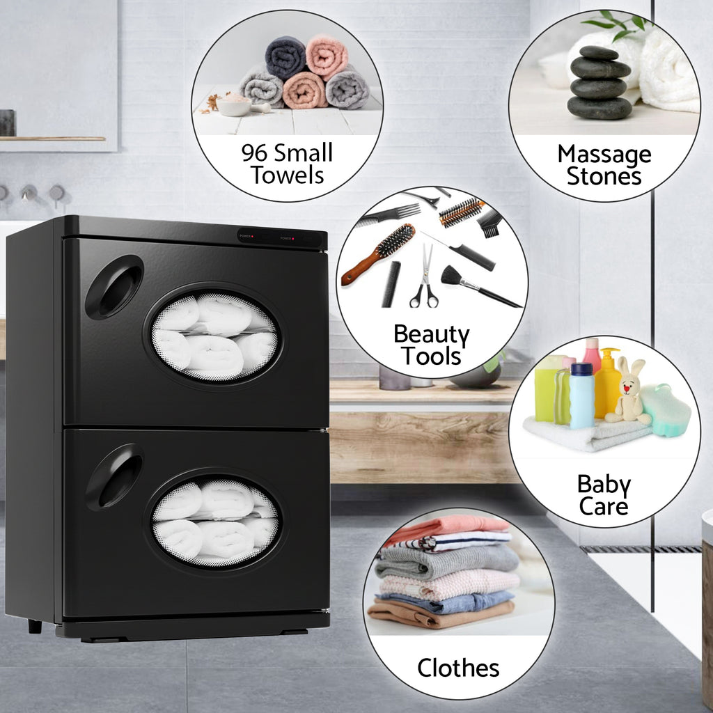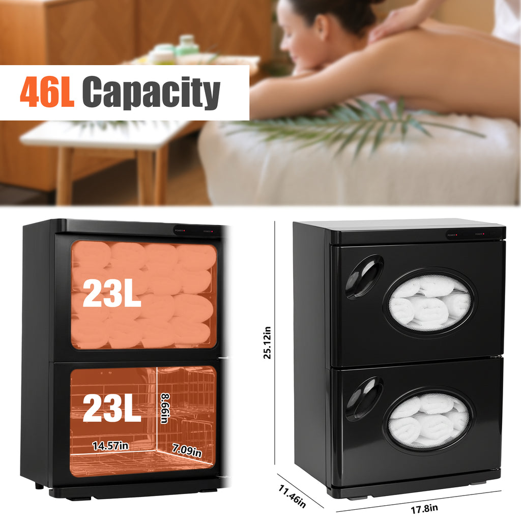 Experience fast, even heating with this 46L high-capacity towel warmer cabinet, featuring a powerful 300W heating system and automatic temperature control. It warms towels to 140–176°F in about 30 minutes, with independent upper and lower zone control for efficient use. Designed with a durable double-layer stainless steel liner and a removable drip tray, it resists rust and is easy to clean. Simply place well-wrung towels inside, switch on the desired zone, and enjoy fresh, warm towels anytime. Ideal for spas, salons, hotels, restaurants, and convenient home use.
