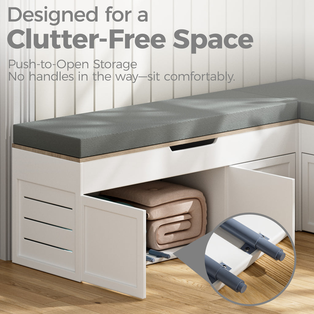 Maximize your space with this modern L-shaped bench featuring handle-free push-to-open cabinets and hidden storage. The ventilated lift-top compartment and deep cabinets keep linens, shoes, or toys organized and fresh. Choose from three water-resistant PU leather cushions (Green/Grey/Black) with supportive high-density foam. Crafted from durable, easy-clean MDF with soft-close hinges. Perfect for compact dining nooks, entryways, or kitchens – combining minimalist style with functional storage.