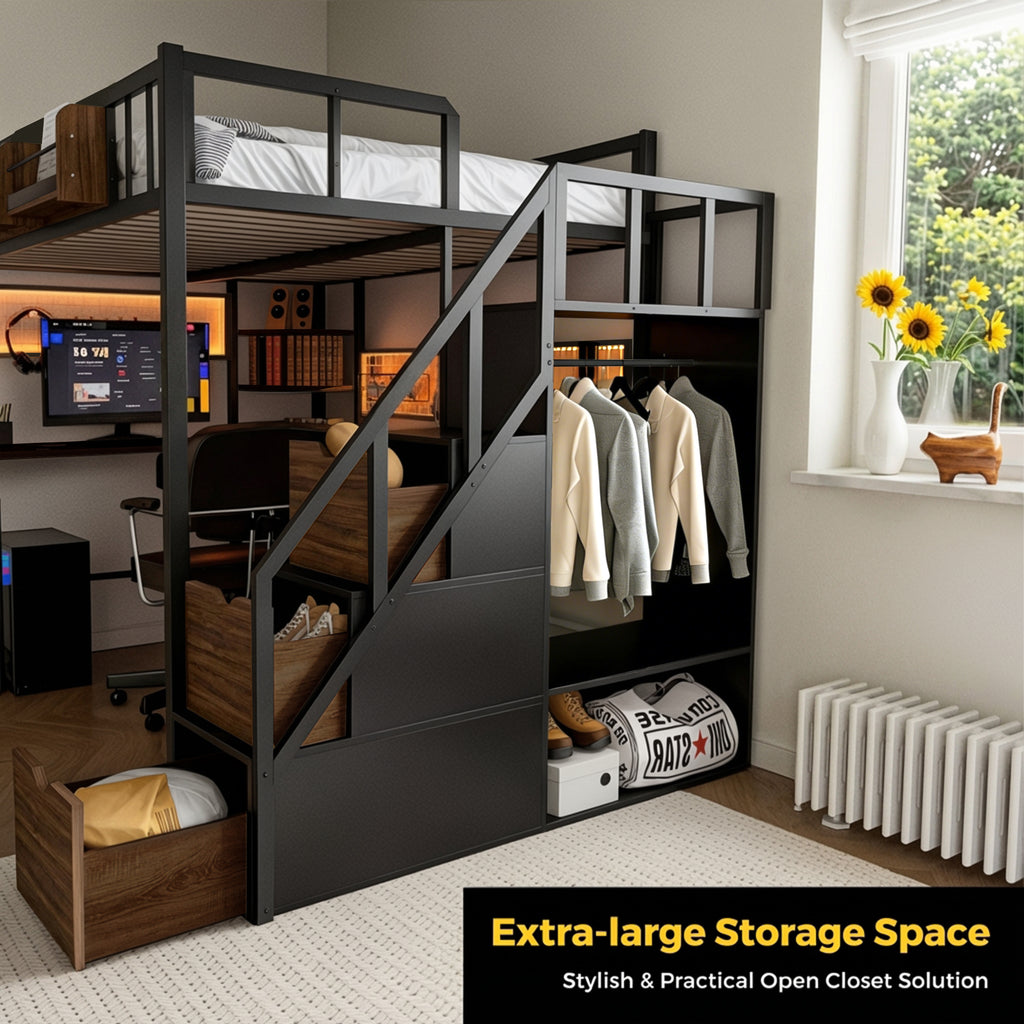 - Space- Saving Metal Loft Bed Frames: Designed for compact rooms, this metal loft bed makes full use of every inch. The 53" clearance under the bed includes a built-in desk, two mesh board, and a generous stair storage area. Beyond the included setup, the versatile under-bed space allows for DIY customization — add a sofa, storage cabinets, or other furniture to suit your needs.