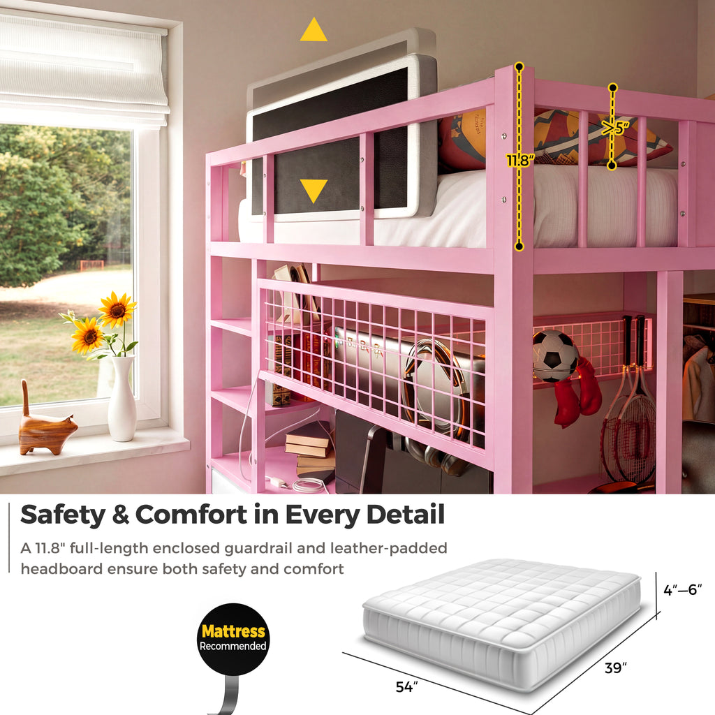 - LED-Lit Desk with Built-in USB Charging: The under-bed area features a spacious desk, a corner shelf, and 3 fabric bins for easy organization. Two mesh boards include 5 hooks and 5 clips for customized decoration. A built-in charging station keeps devices powered, while the dual RGB LED light strip adds a vibrant touch with adjustable brightness, color, and mood settings—perfect for studying, relaxing, or gaming.