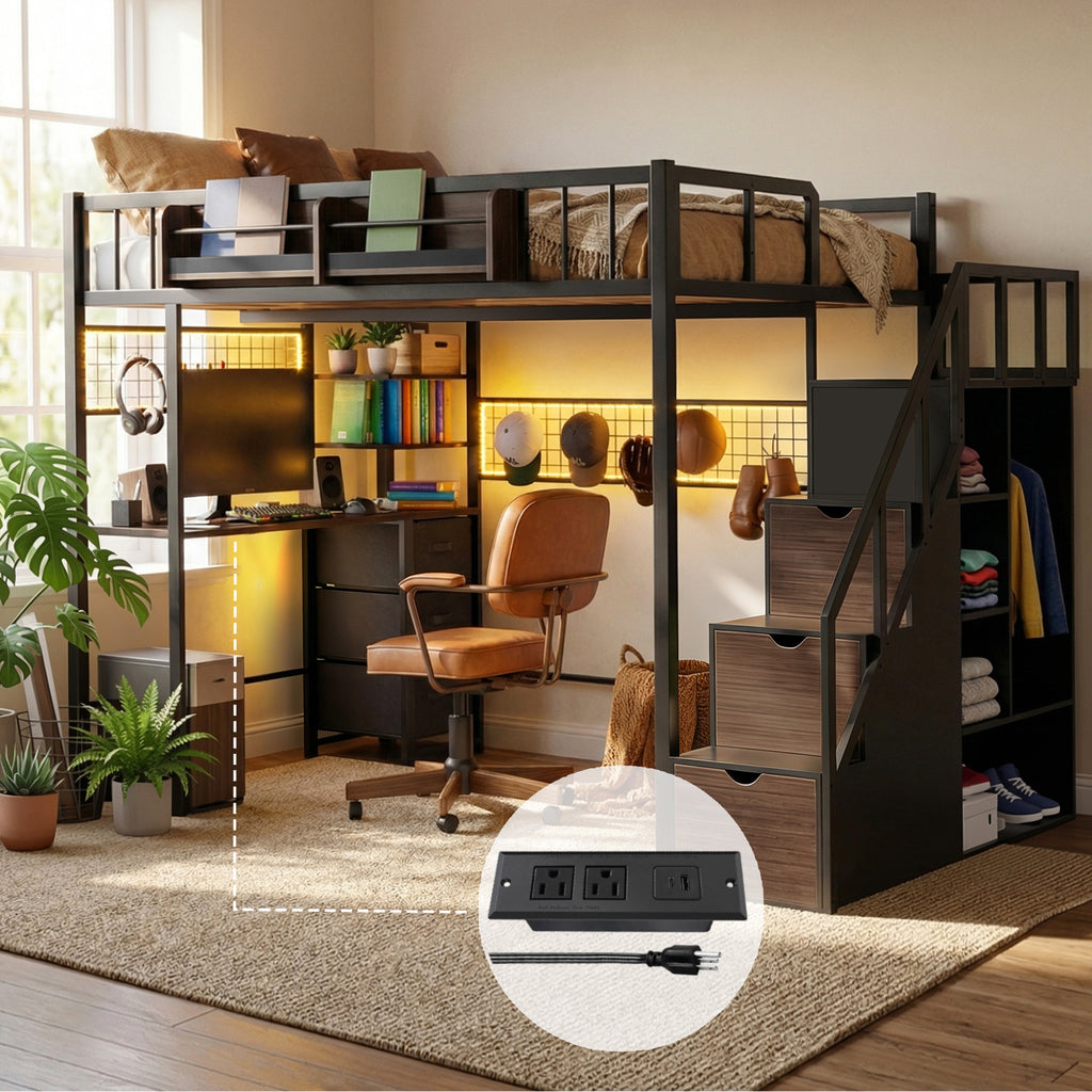 This space-saving loft bed combines safety and functionality with a sturdy engineered wood and metal frame, step-style stairs, and anti-tipping features. The 53" under-bed area houses a built-in desk, stair storage, and customizable space for DIY setups. Enjoy smart storage with 3 stair drawers, a wardrobe, and shelves, plus an LED-lit desk with USB charging and RGB mood lighting. Easy to assemble, waterproof, and supports 350 lbs. Delivered in two boxes with dedicated customer support. Ideal for compact rooms!