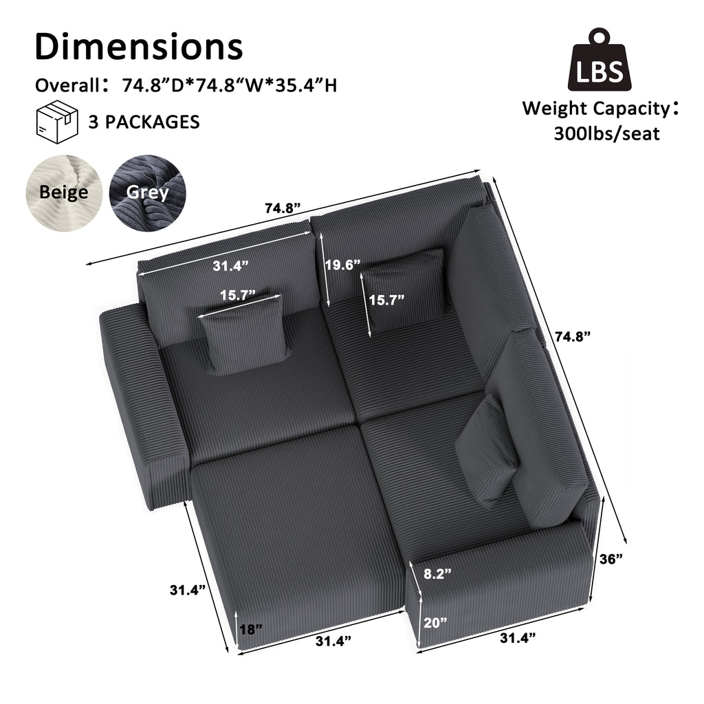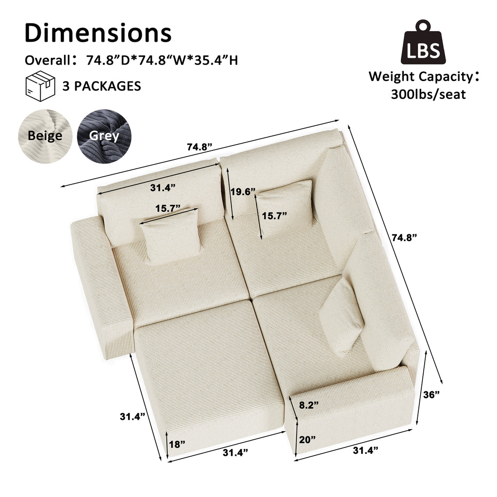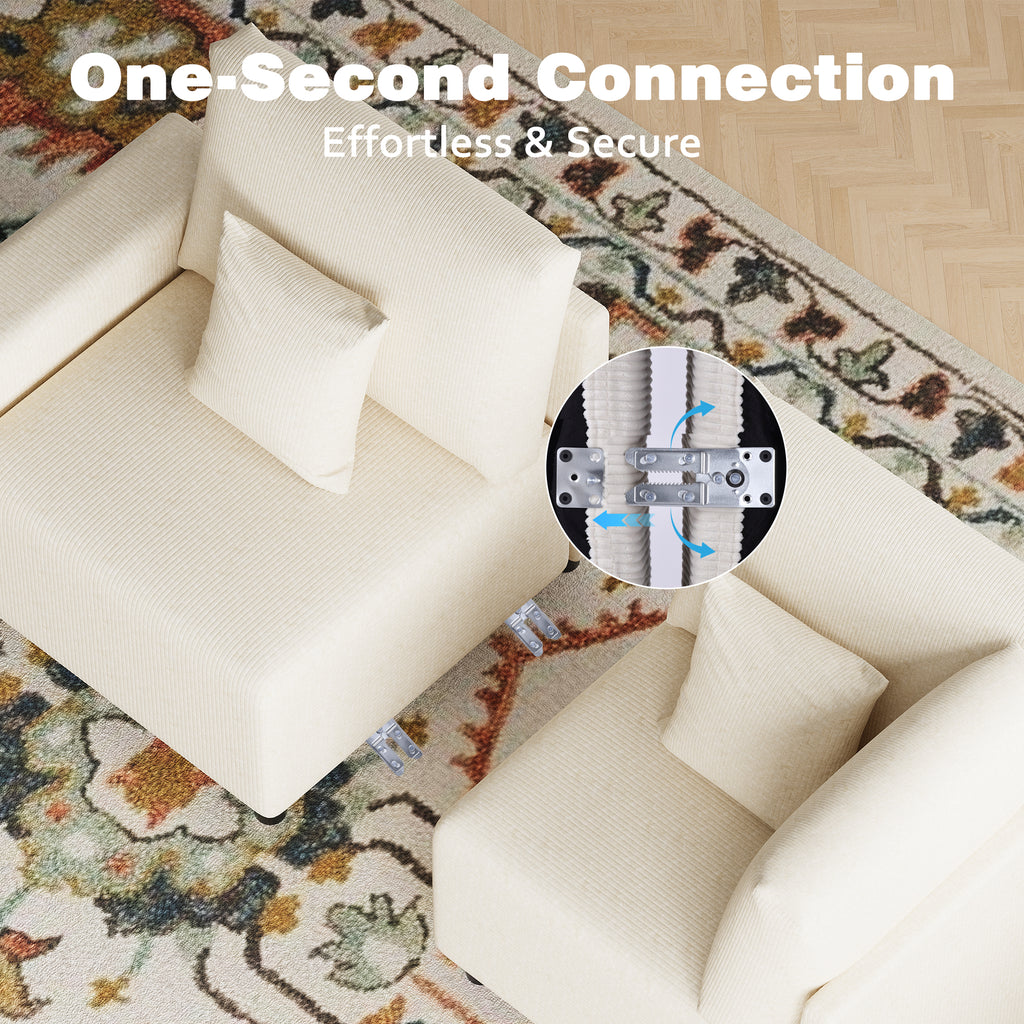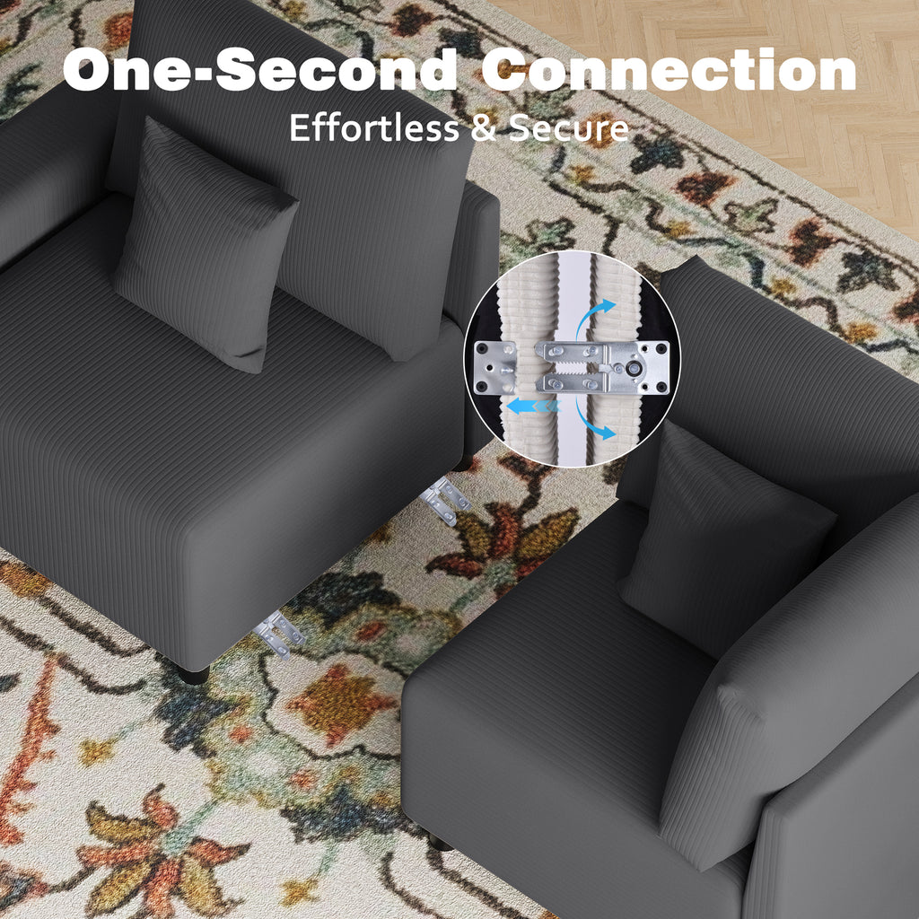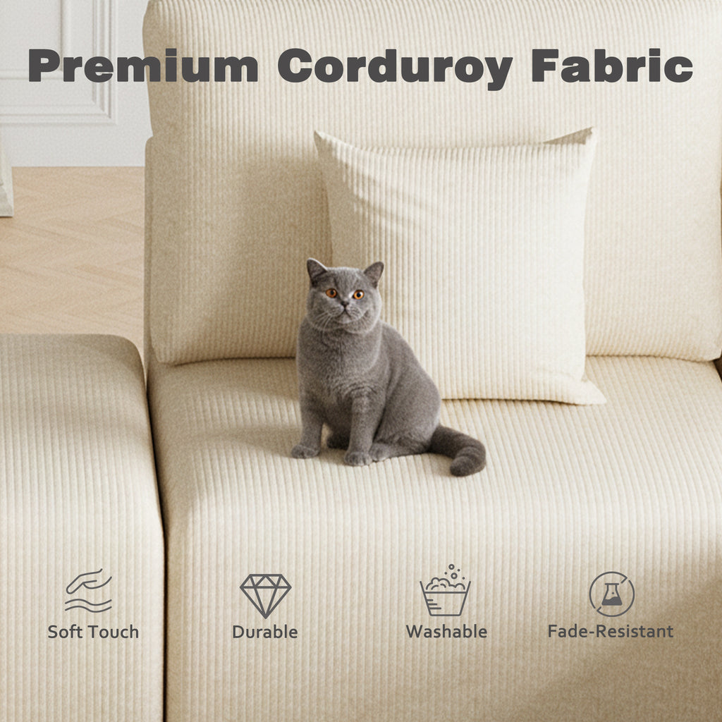 Premium Corduroy & Removable Covers: Crafted from luxurious corduroy, this modular sectional delivers a rich, velvety texture that’s soft, durable, and cozy. All seat covers are removable and machine-washable, making maintenance effortless—perfect for families with kids or pets