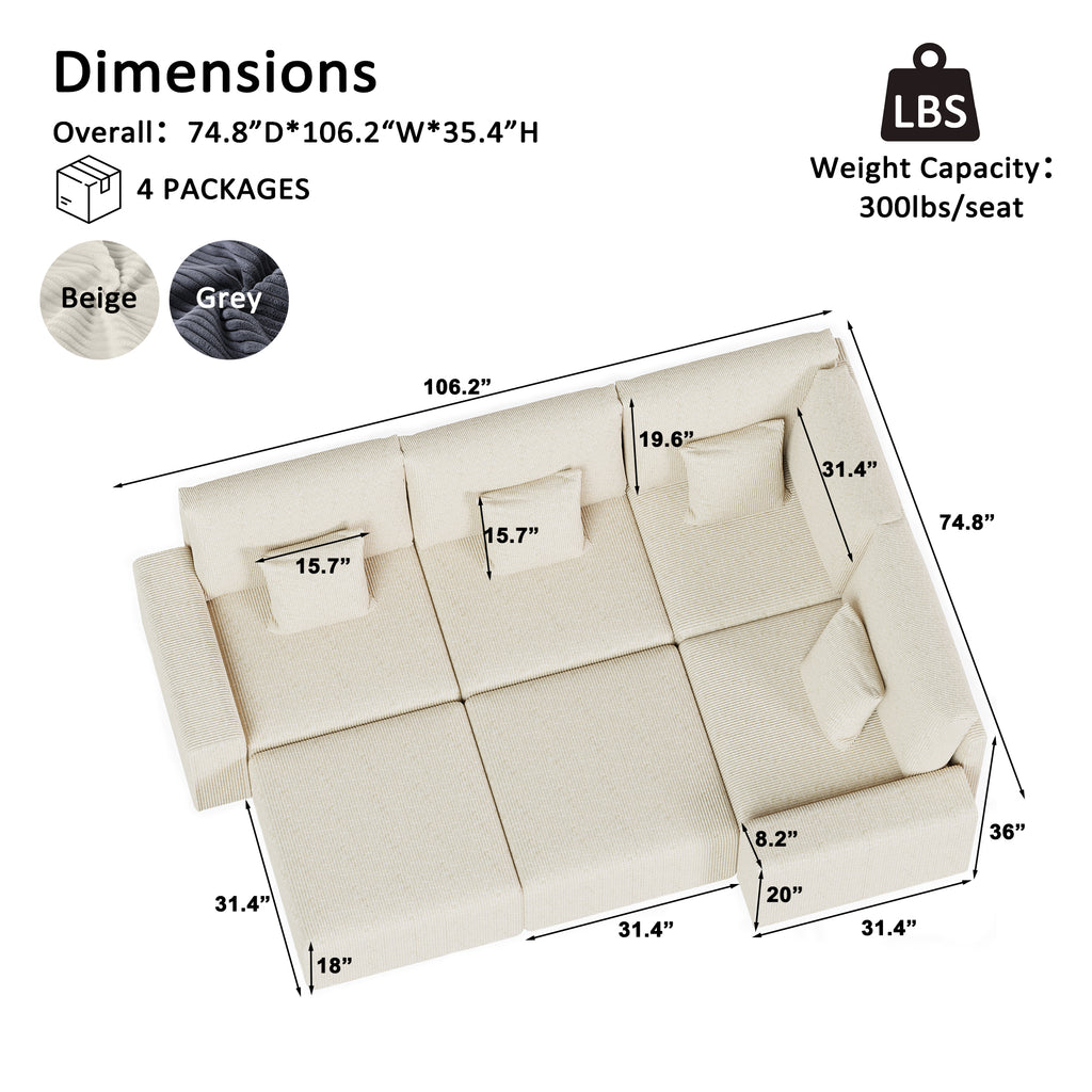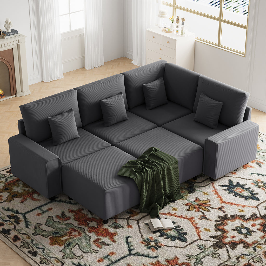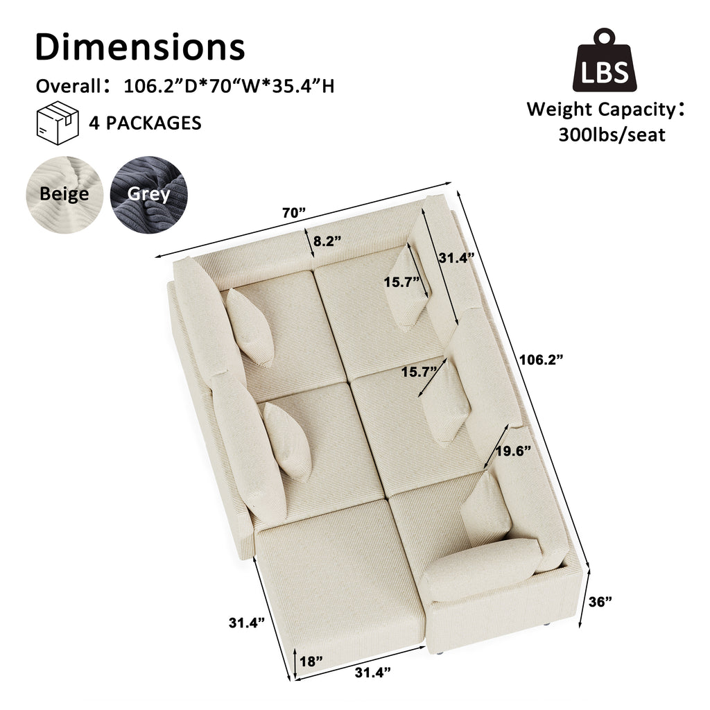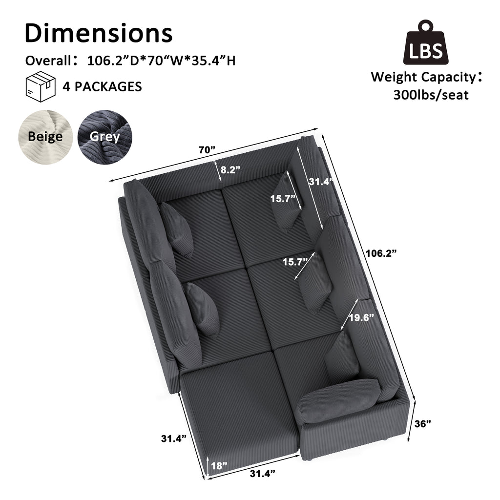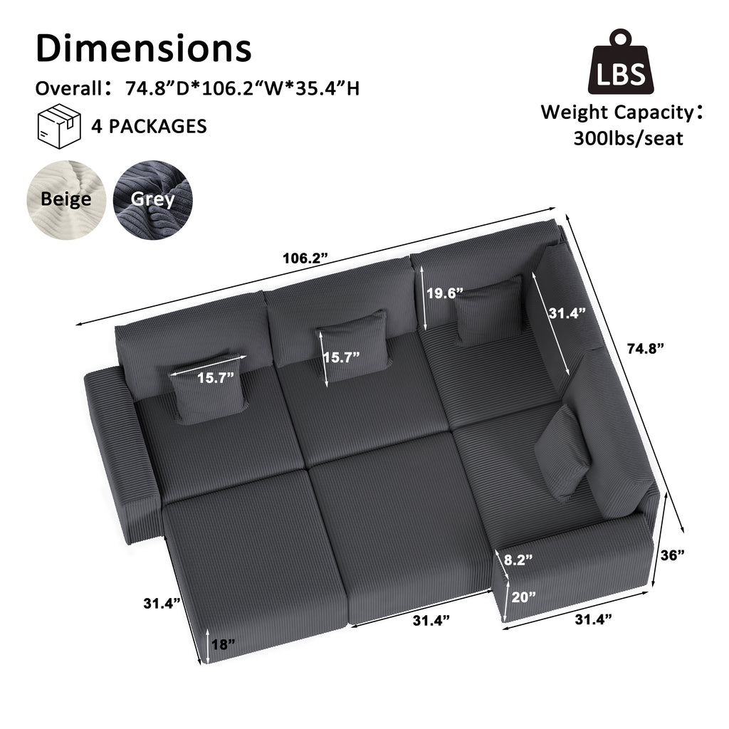 Premium Corduroy & Removable Covers: Crafted from luxurious corduroy, this modular sectional delivers a rich, velvety texture that’s soft, durable, and cozy. All seat covers are removable and machine-washable, making maintenance effortless—perfect for families with kids or pets