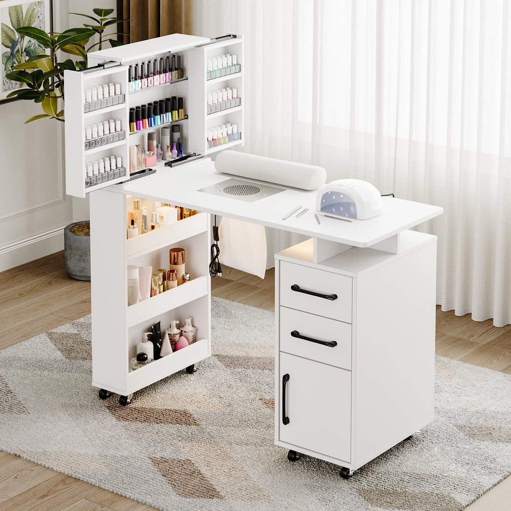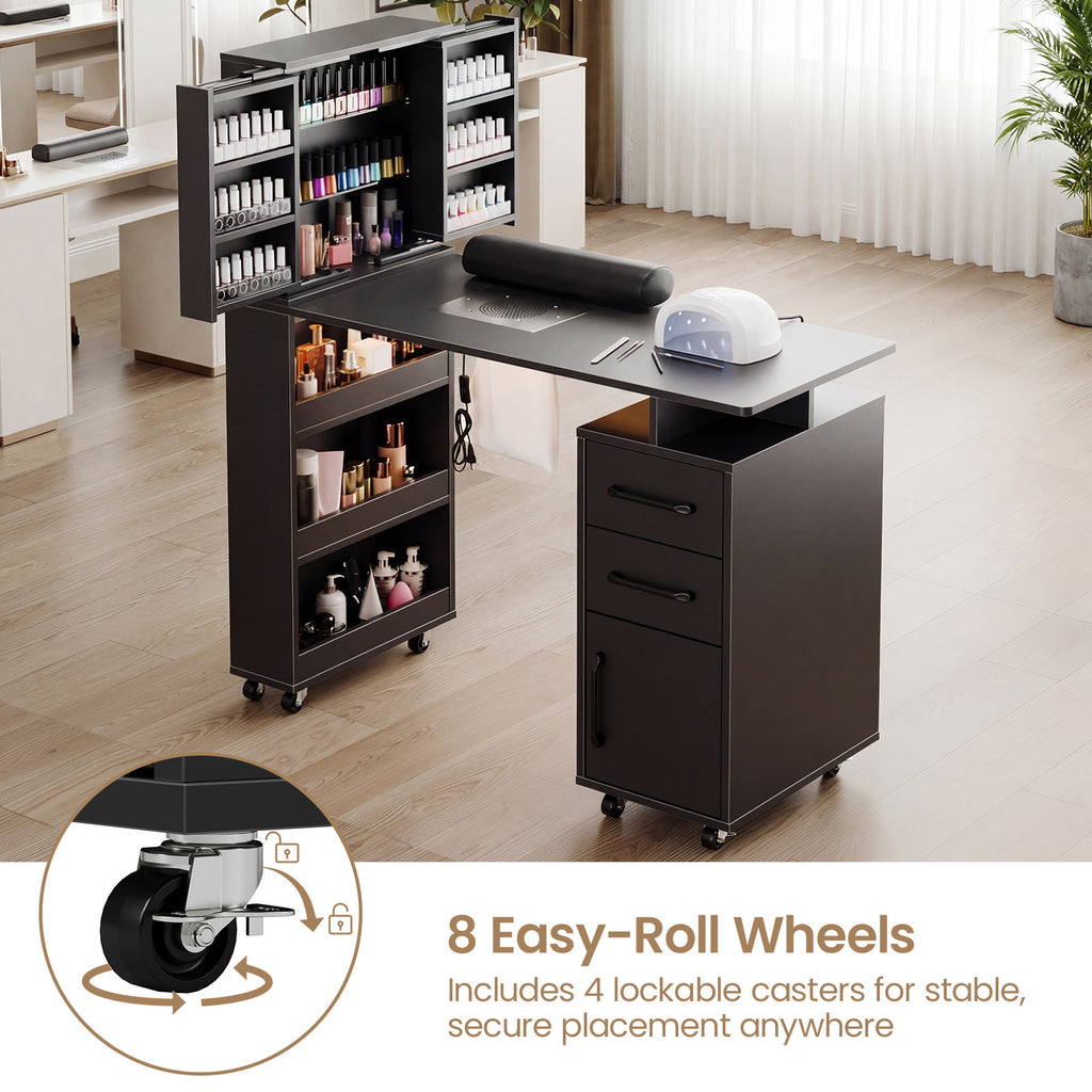 Ample Storage & Smooth Mobility: This professional nail desk features an extendable nail polish cabinet, three open shelves, two smooth-glide drawers, and a spacious cabinet. Eight rolling wheels (four lockable) allow smooth movement and stable positioning.