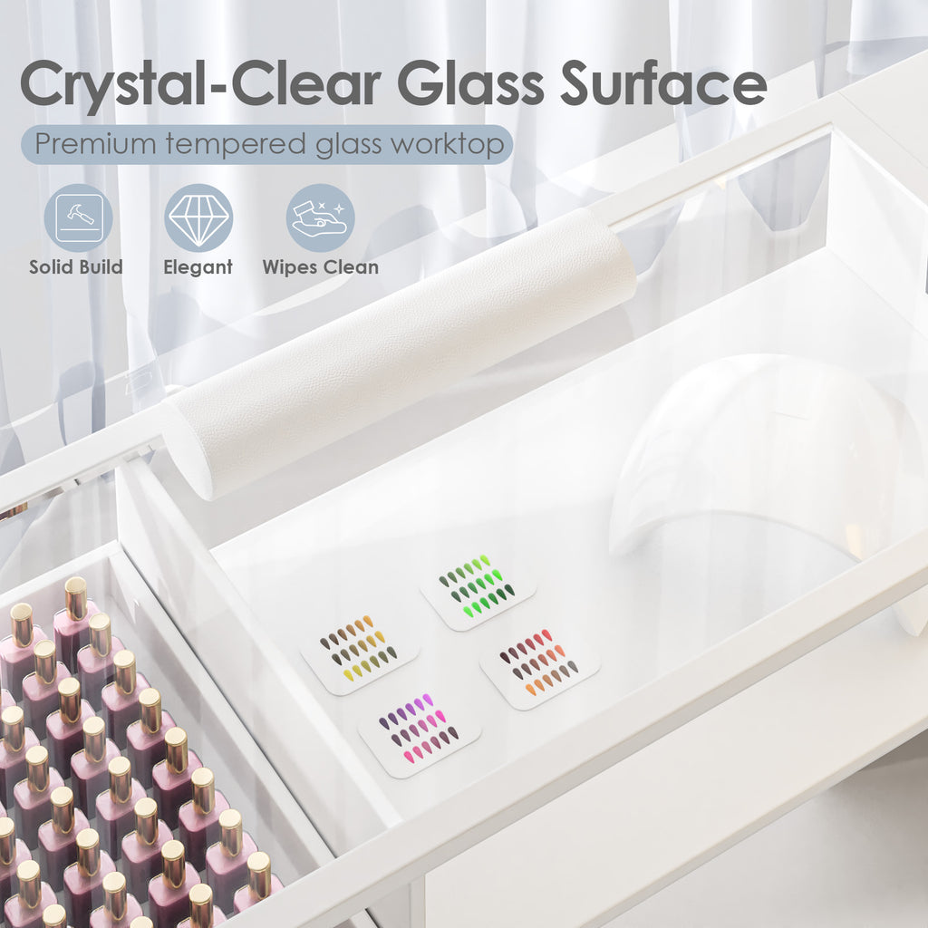 - Premium Materials with Full Support: Crafted with durable MDF and a smooth tempered glass top, this nail table is built to last. Includes a soft manicure wrist rest for extra comfort. Easy to assemble with clear step-by-step instructions. Need help? Our support team responds quickly.