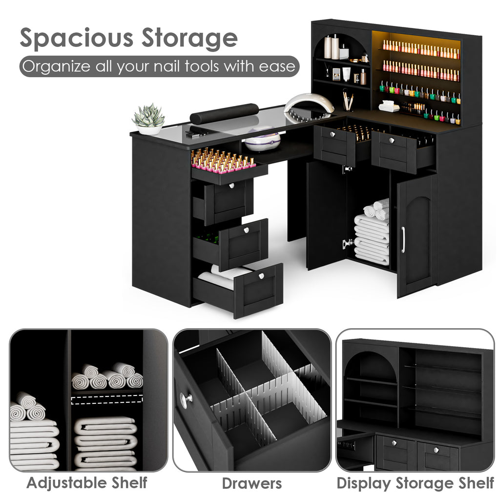 L-Shaped Glass Nail Table with LED Display & Ample Storage