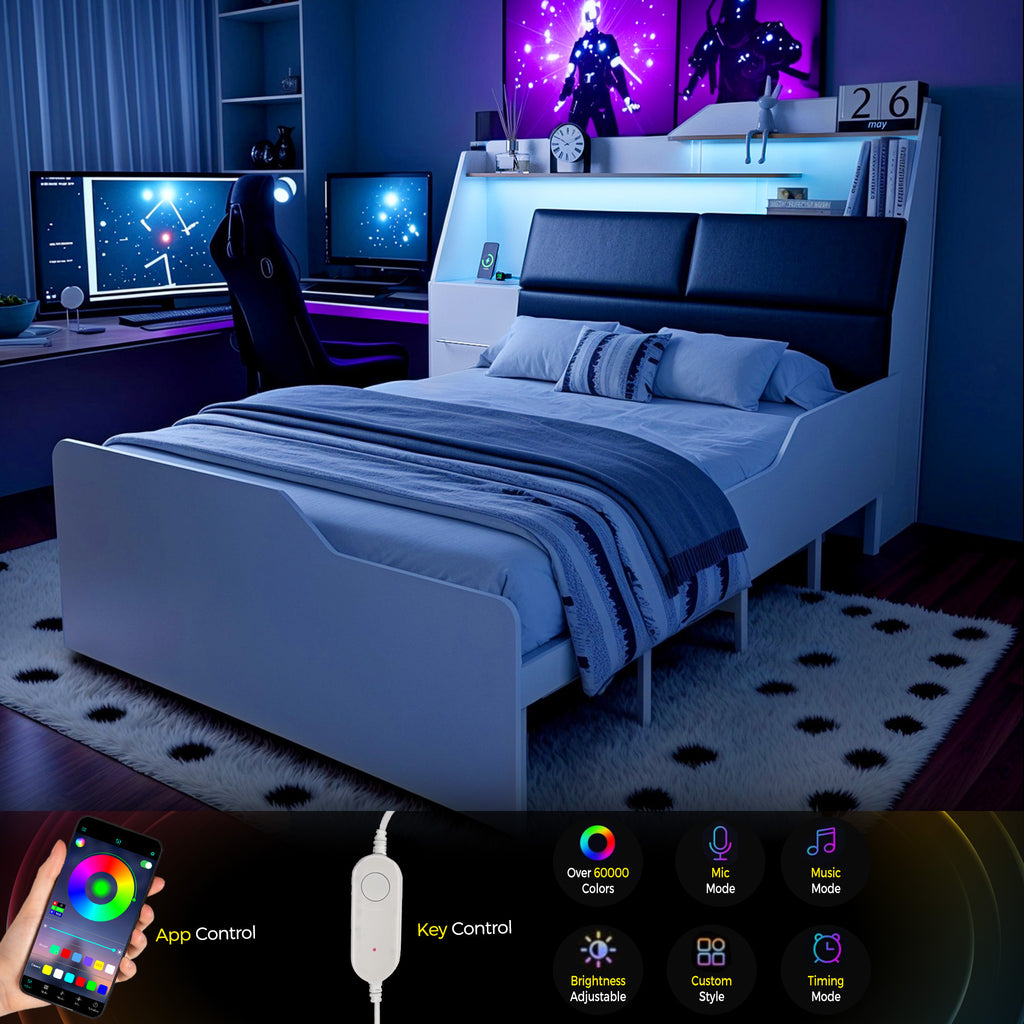 RGB LED Headboard with Smart App Control: The LED bed frame features a headboard with smart RGB LED light strips, offering 16 million color options and 20+ lighting effects. Easily control lighting via the app or switch—great for creating ambiance, night lighting, or enhancing bedroom decor.