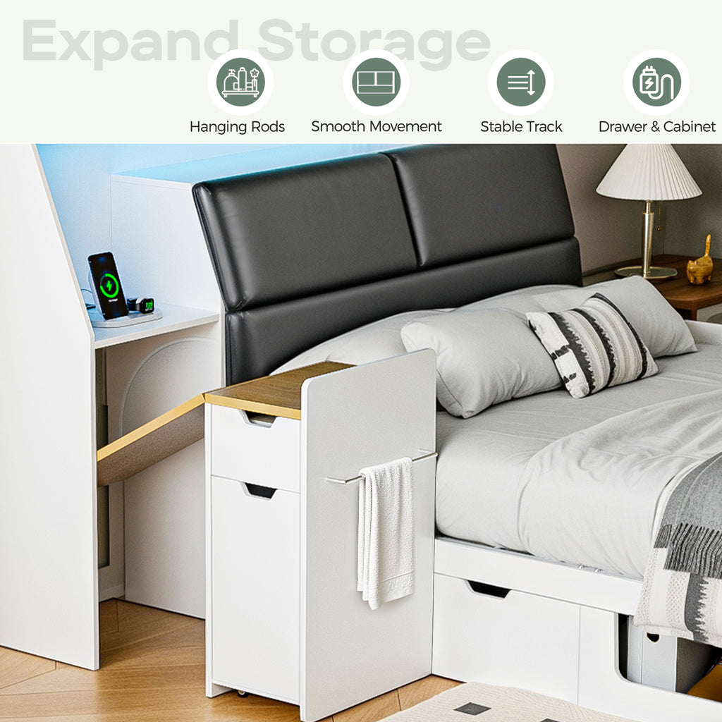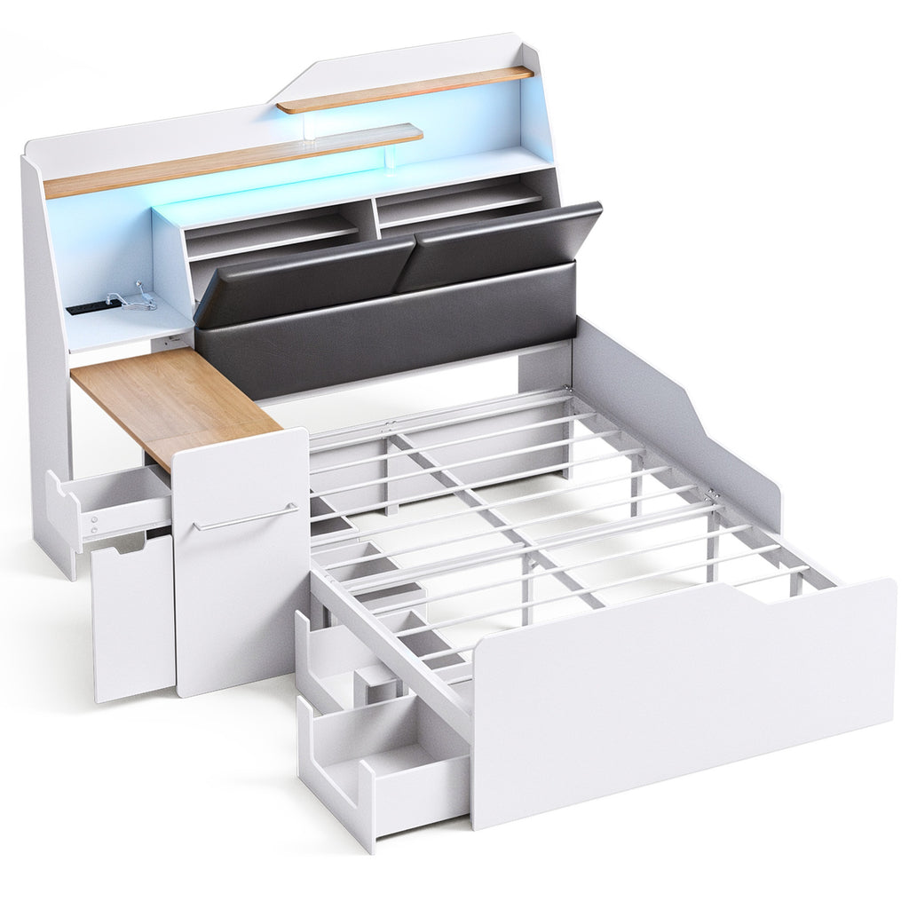 Maximize your small space with this innovative Bed & Desk Combo. Perfect for bedrooms, apartments, dorms, or home offices, it features a hidden, slide-out desk (replacing a nightstand) plus under-bed drawers and cabinet storage. Stay incredibly organized with the storage headboard and open display shelves. Elevate your ambiance with the smart RGB LED headboard (16M colors, 20+ effects, app/switch controlled). Stay charged via the integrated headboard power station (2 outlets, USB, USB-C). Built for durability and quiet sleep with a heavy-duty metal frame, center support, and noise-reducing strips, it arrives with easy-to-follow instructions for quick assembly.
