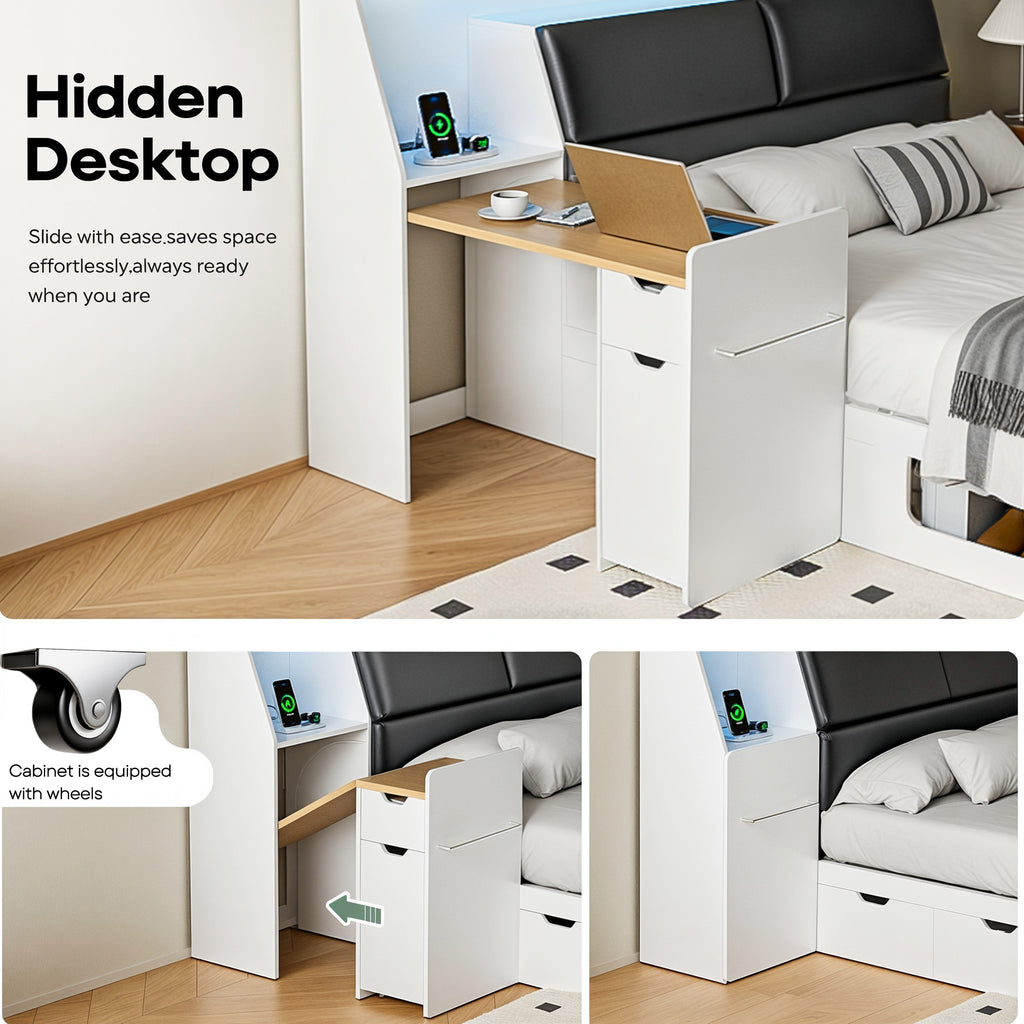 Bed & Desk Combo Design: Ideal for Small Spaces: This bed frame with desk combo is designed for small bedrooms, apartments, and multifunctional spaces. The hidden foldable desk slides out easily and includes drawers and cabinet storage underneath. A smart alternative to a traditional nightstand—perfect for kids’ rooms, student dorms, or home office setups.