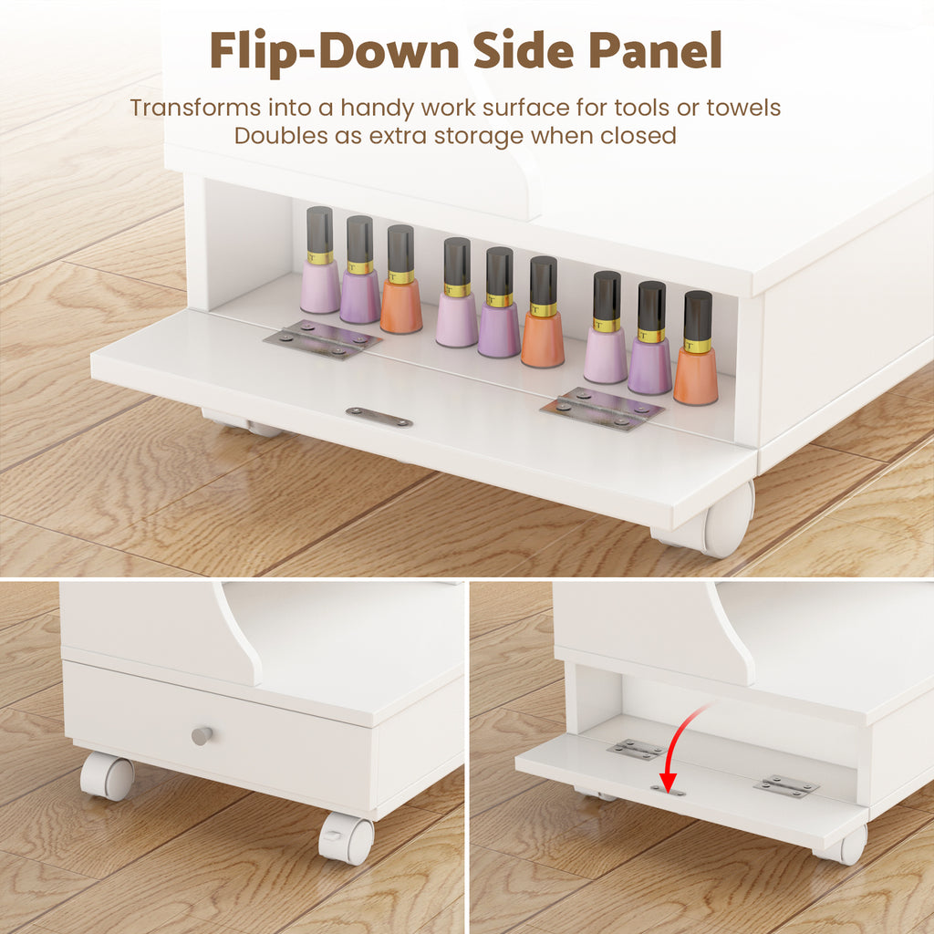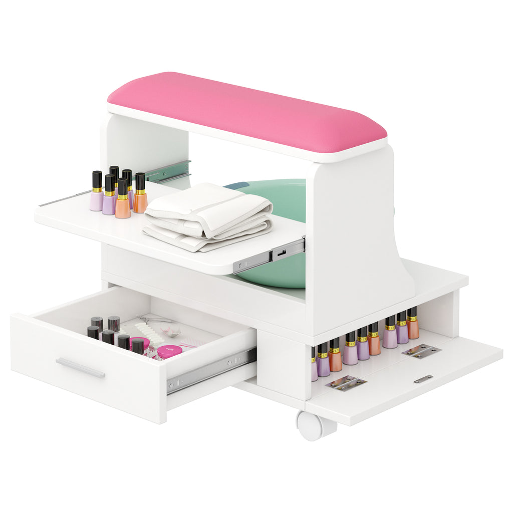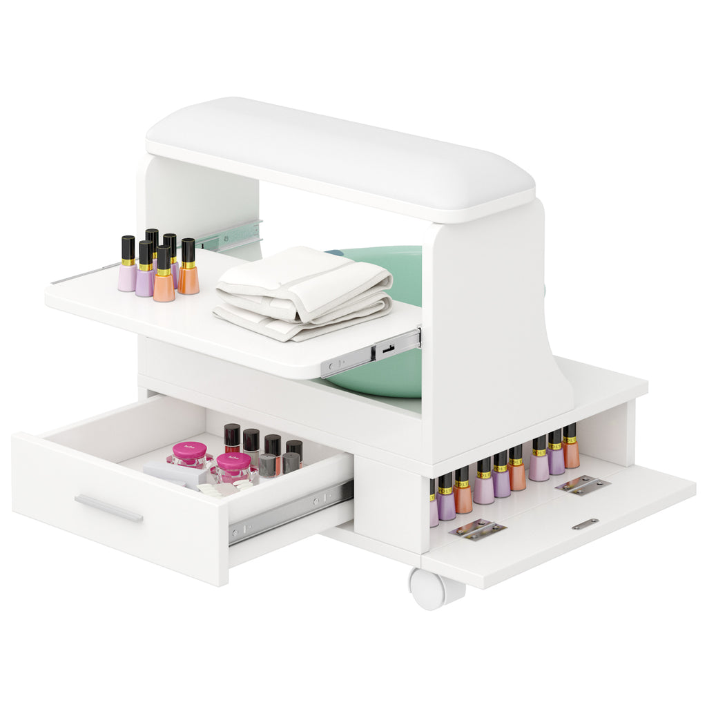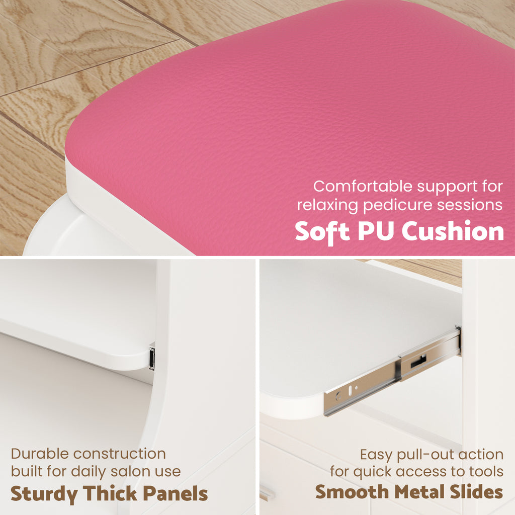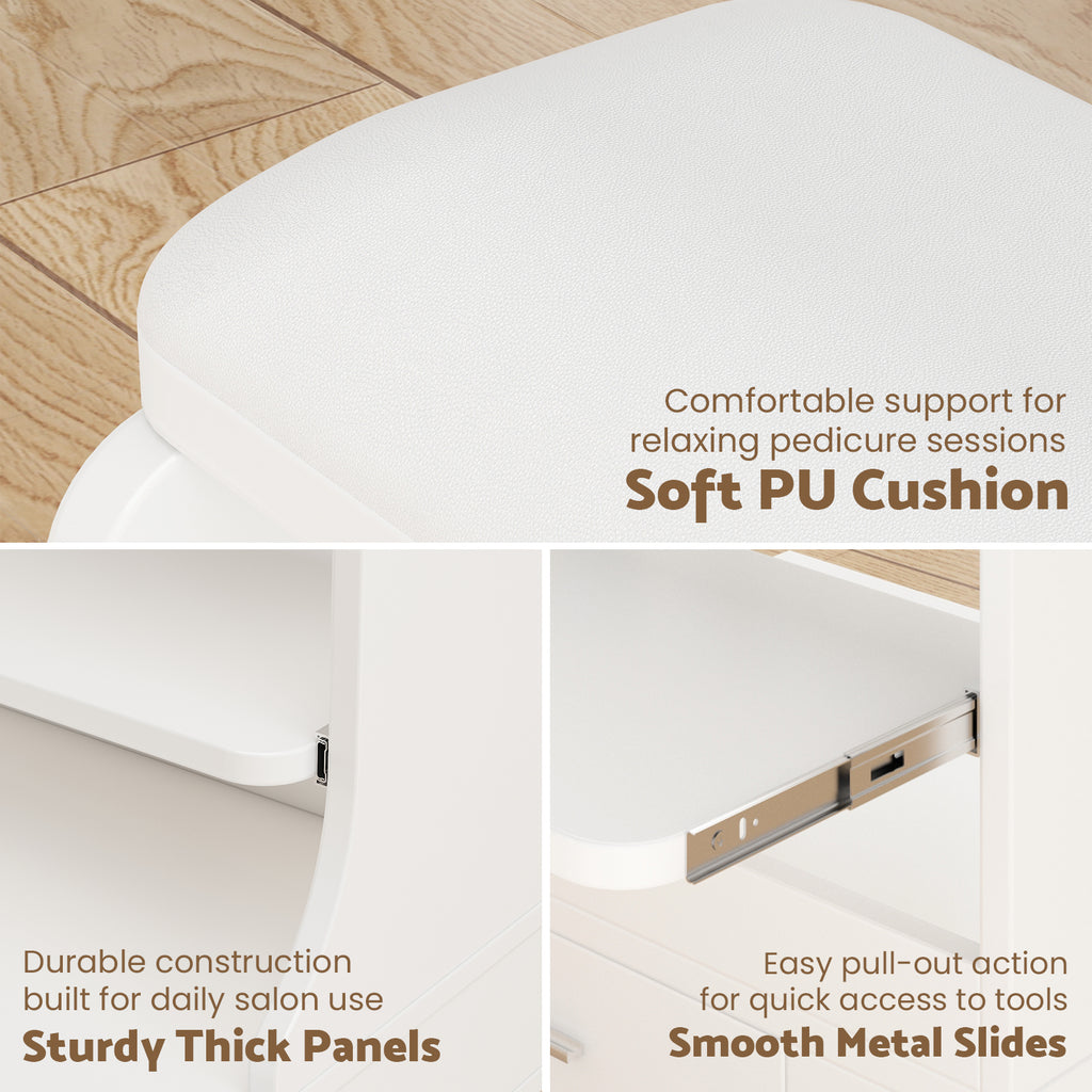 - Large Multi-Storage Design: Features a pull-out tray, smooth drawer, and a side storage cabinet with a flip-down door that doubles as a small shelf. The enlarged bottom area is designed to fit most foot bath basins for convenient soaking during pedicure sessions.