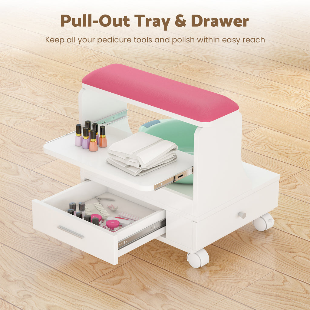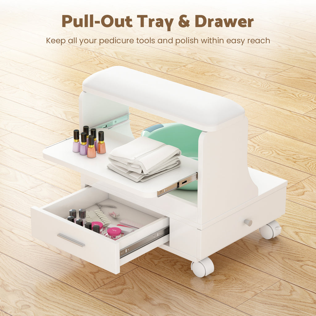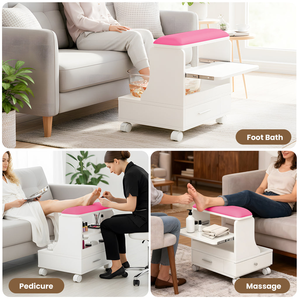 Upgrade your salon or home spa setup with this multifunctional pedicure footrest station. Designed with multiple storage options—including a pull-out tray, smooth drawer, and flip-down side cabinet—it keeps tools organized and within reach. The ergonomic PU foot cushion offers ideal comfort and support, while the sturdy MDF structure provides reliable stability with a 45 lbs load capacity. Equipped with smooth-rolling wheels and two locking casters, it moves effortlessly and stays securely in place. Easy to assemble and perfect for pedicures, nail care, foot spa treatments, and professional salon use.