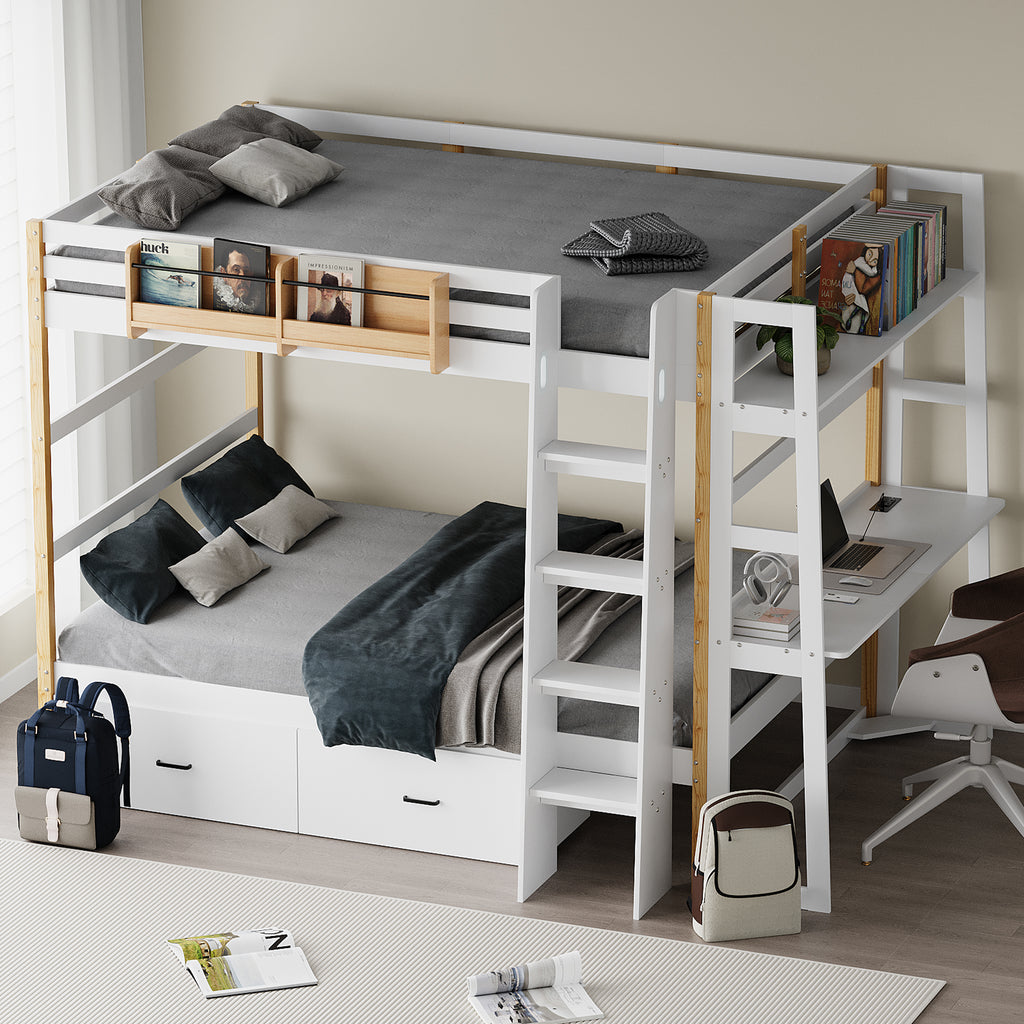 Solid pine wood bunk bed with convertible side table featuring built-in outlets and bookshelf. Includes angled ladder for safe access, under-bed rolling drawers for extra storage, and app-controlled multicolor LED lights with side rack. Durable, space-saving, and perfect for kids’ rooms, dorms, or vacation homes.