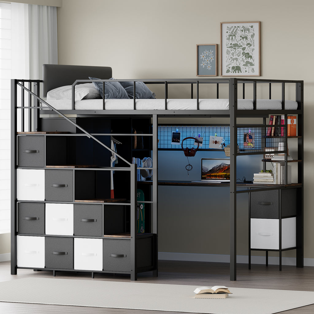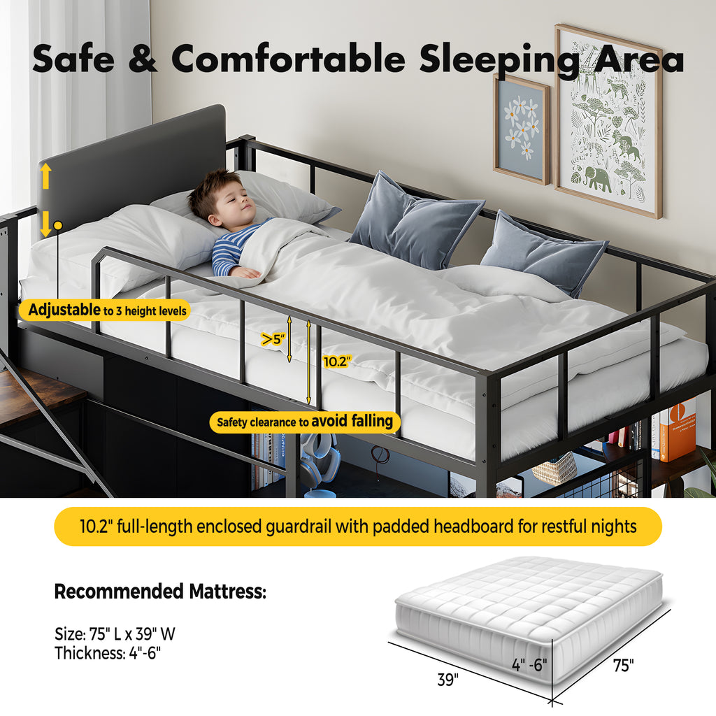 - Special Feature: Safty with guardrails and stairs; Convenient with charging station and LED light; Semi-enclosed design for privacy; Customizable with mix-and-match fabric drawers; Reversible layout featuring an adjustable padded headboard; No Box Spring Needed; Space Saving; Heavy Duty; Durable; Stable