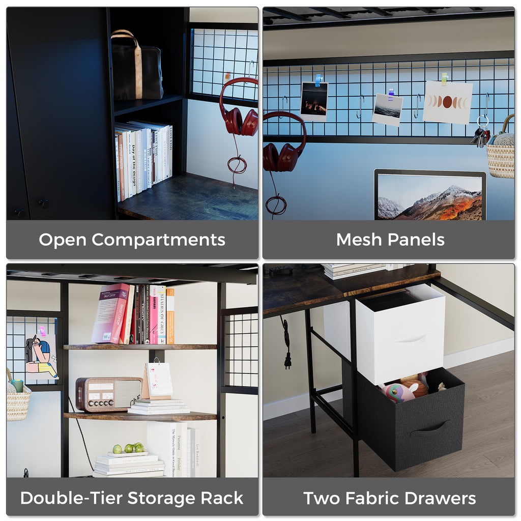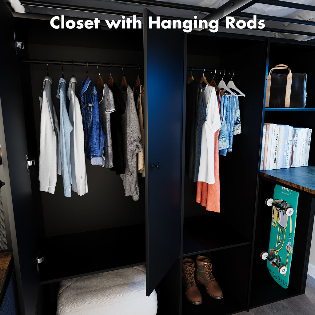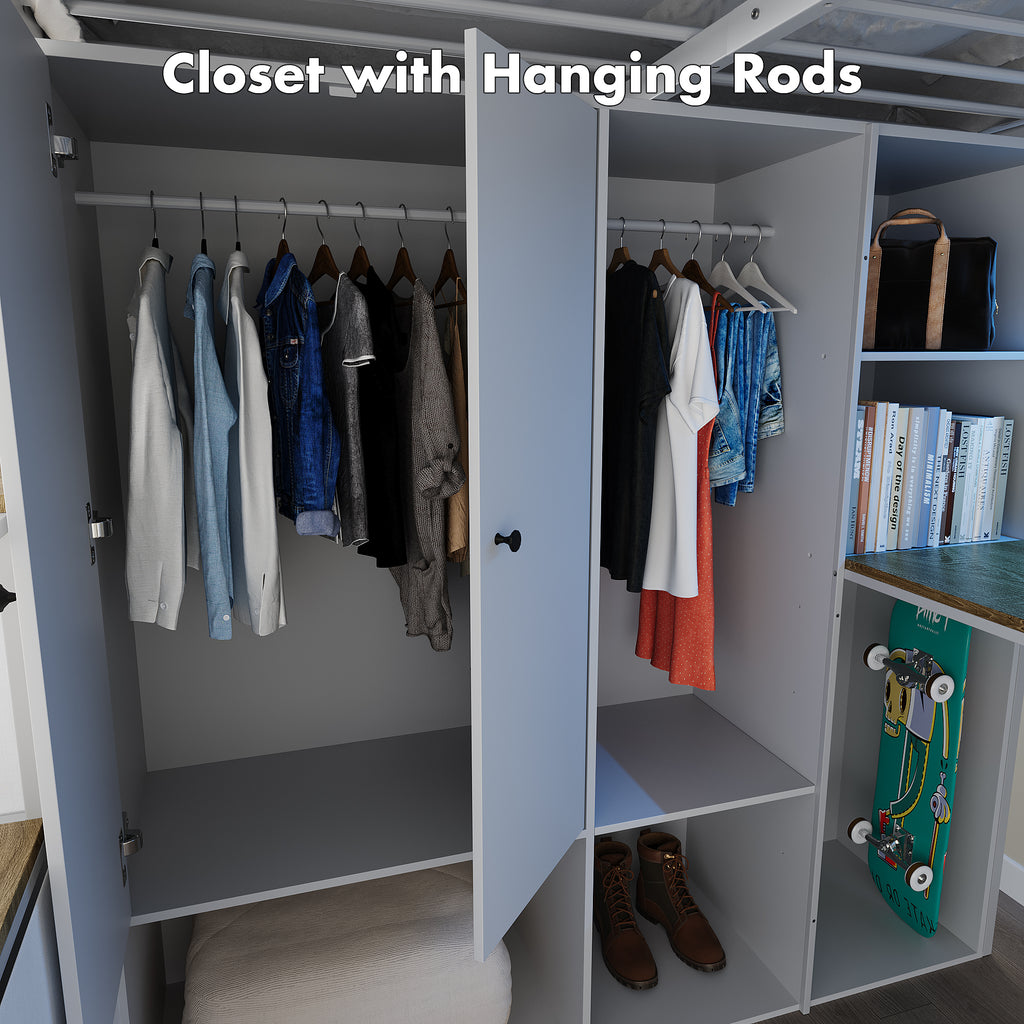 - Included Components: Closet & Hanging Rod, Guardrails, Headboard, LED Light & Charging Station, Mesh Panels with 5 Hooks and 5 Clips, Storage Stairs & Fabric Drawers