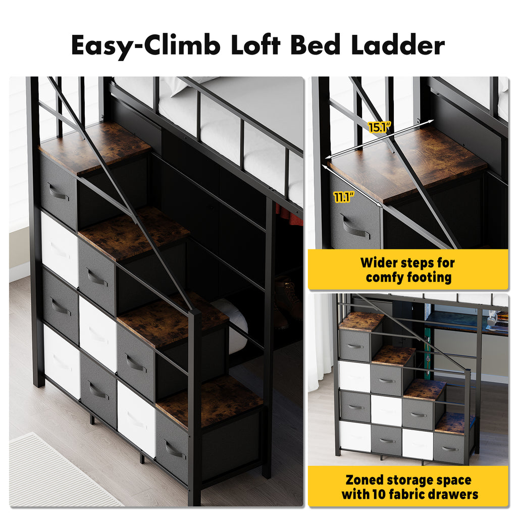 - Safe Stairs with Privacy: The sturdy staircase with handrails features 10 storage drawers that create a semi-enclosed, private space underneath. The fabric drawers can be freely mixed and matched for a fun, personalized look that complements any bedroom décor.