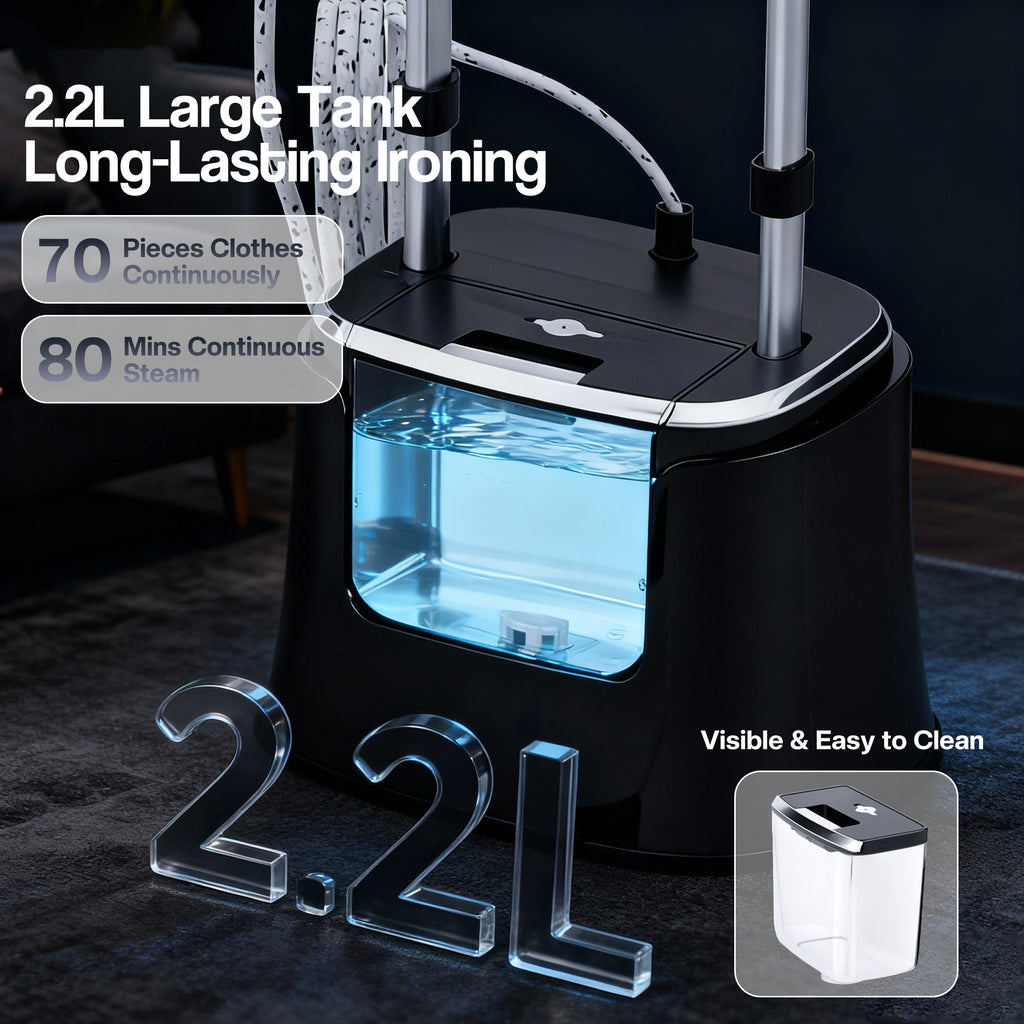 - Large 2.2L Water Tank & 80min Continuous Use: The 2.2-liter detachable tank provides up to 80 minutes of powerful, continuous steam, letting you handle an entire family’s clothes in one go. Its transparent design helps you easily monitor water levels and refill as needed.