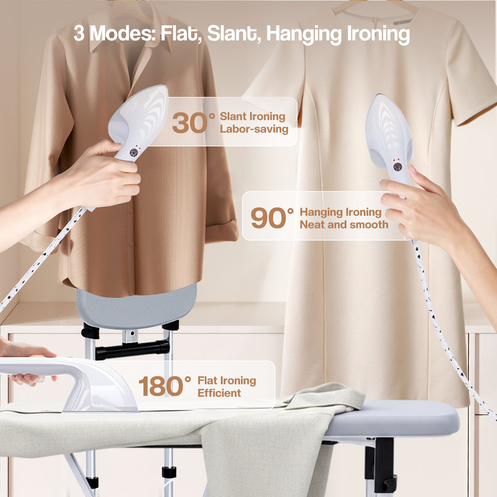 - Multi-Angle Ironing—Flat, Hanging & Diagonal: The versatile foldable ironing board supports 180° flat ironing, 90° hanging steaming, and 30° diagonal ironing to suit any garment type. Perfect for shirts, dresses, curtains, or bedding — all from one flexible setup.