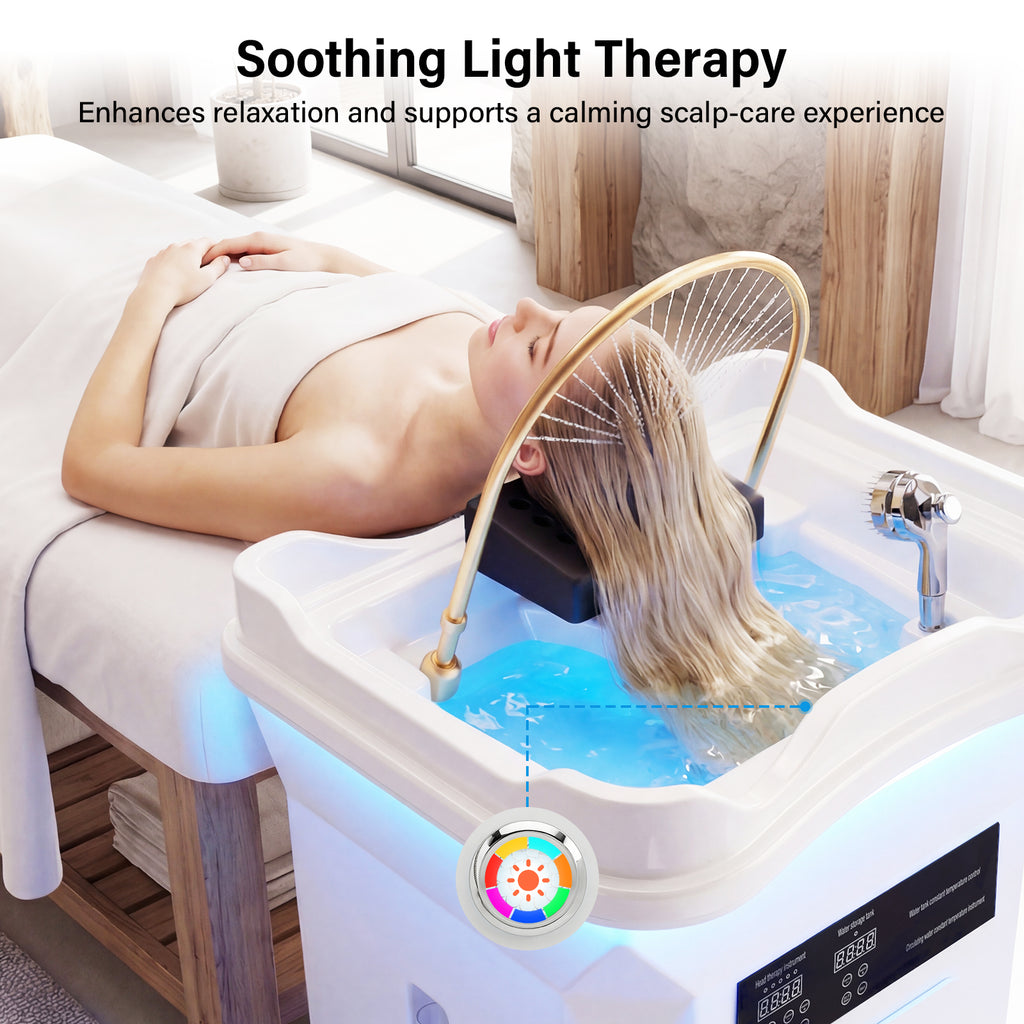 Light Therapy for Scalp Care: Built-in LED chromotherapy provides gentle, multi-color light treatment to nourish the scalp, promote relaxation, and create a premium atmosphere during treatments.