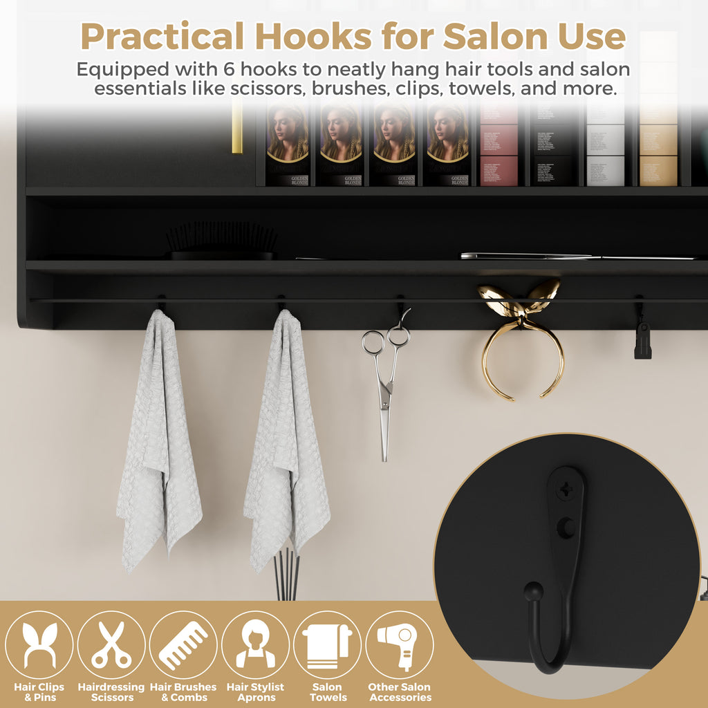 - Quick-Access Hanging Storage: Features a hanging wire for hair color tubes and six hooks for small salon accessories like clips, towels, and gloves, keeping items easily accessible during services
